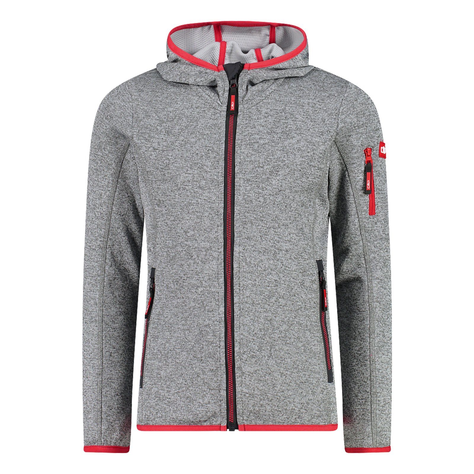 Diese sportive Strickjacke besteht aus Knit-Tech - einem Material, das aus einer speziellen Textilmischung hergestellt wurde und somit besonders wärmend und bequem ist. Im Inneren der Jacke wurde für eine optimale Atmungsaktivität luftiges Mesh verwendet. Außerdem besitzt sie eine feste Kapuze und einen durchgehenden Reißverschluss. Dieser schließt schön hoch und ist im oberen Bereich winddicht unterlegt sowie mit einem Kinnschutz ausgestattet. Schmale Elastikbündchen hat die leichte Jacke am Saum, den Ärmelabschlüssen sowie an der Kapuze. Während die zwei seitlichen Reißverschlusstaschen zusammen mit der Ärmeltasche genügend Platz bieten, machen die Logo-Details und die Melange-Optik das Design der Jacke perfekt. Kleine Outdoor-Fans werden die Kid Fix Hood Jacket von CMP lieben, egal ob als Midlayer oder Außenschicht!