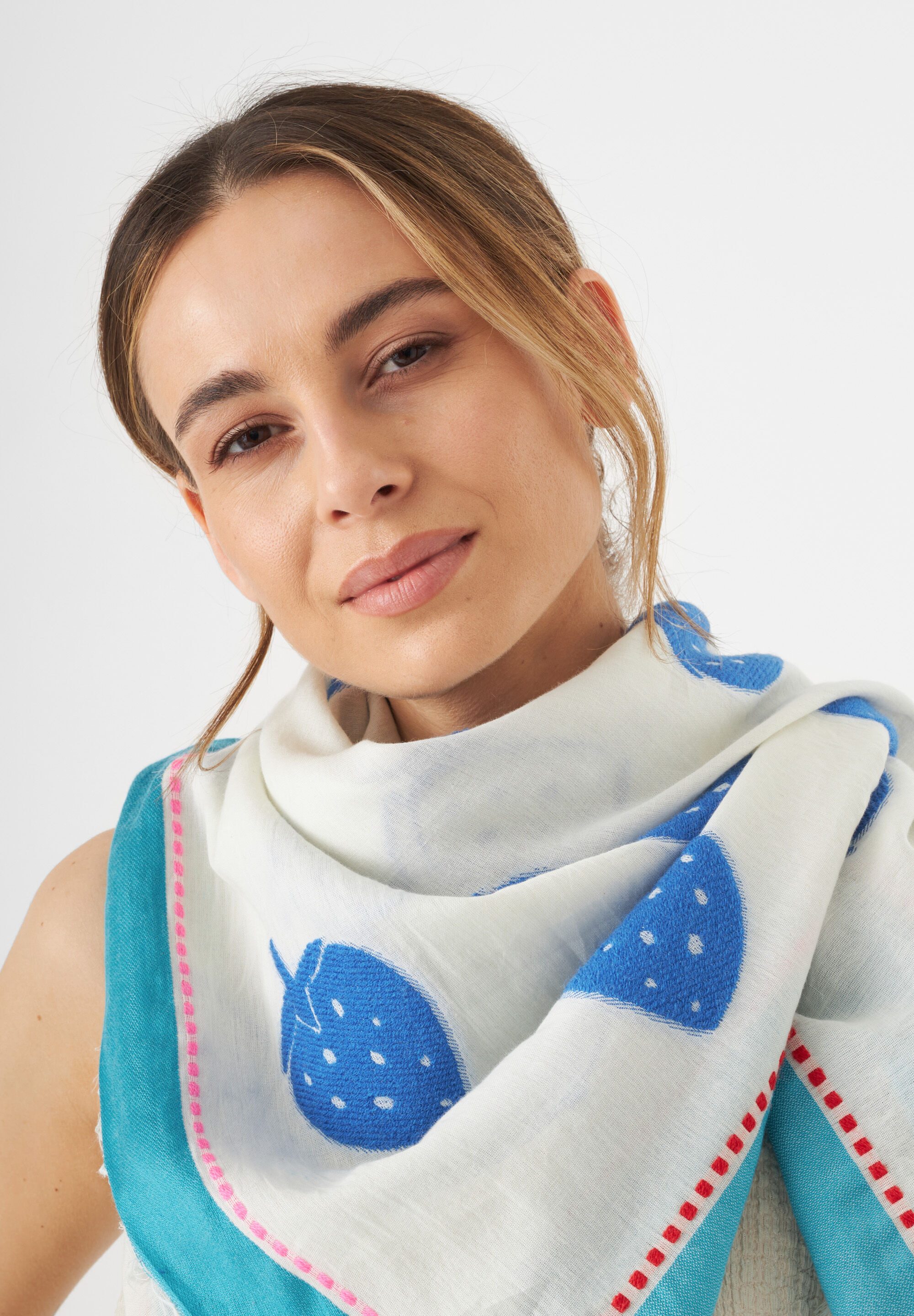 Styling kann so einfach sein. Eine gut sitzende Jeans, ein schlichtes Shirt und als Hingucker dieses stylische Erdbeer-Tuch. Das hochwertige Jacquard-Tuch wurde aus reiner Baumwolle in einer indischen Manufaktur in Fil Coupé-Technik hergestellt, in der die Jacquard-Weberei eine lange Tradition hat. Bei dem doppelt gewebten Tuch wurde das Erdbeermuster in kontrastierenden Farben gewebt und anschließend ausgeschnitten. Das dekorative Kontrast-Stitching an den Kanten unterstreicht den handwerklichen Look.