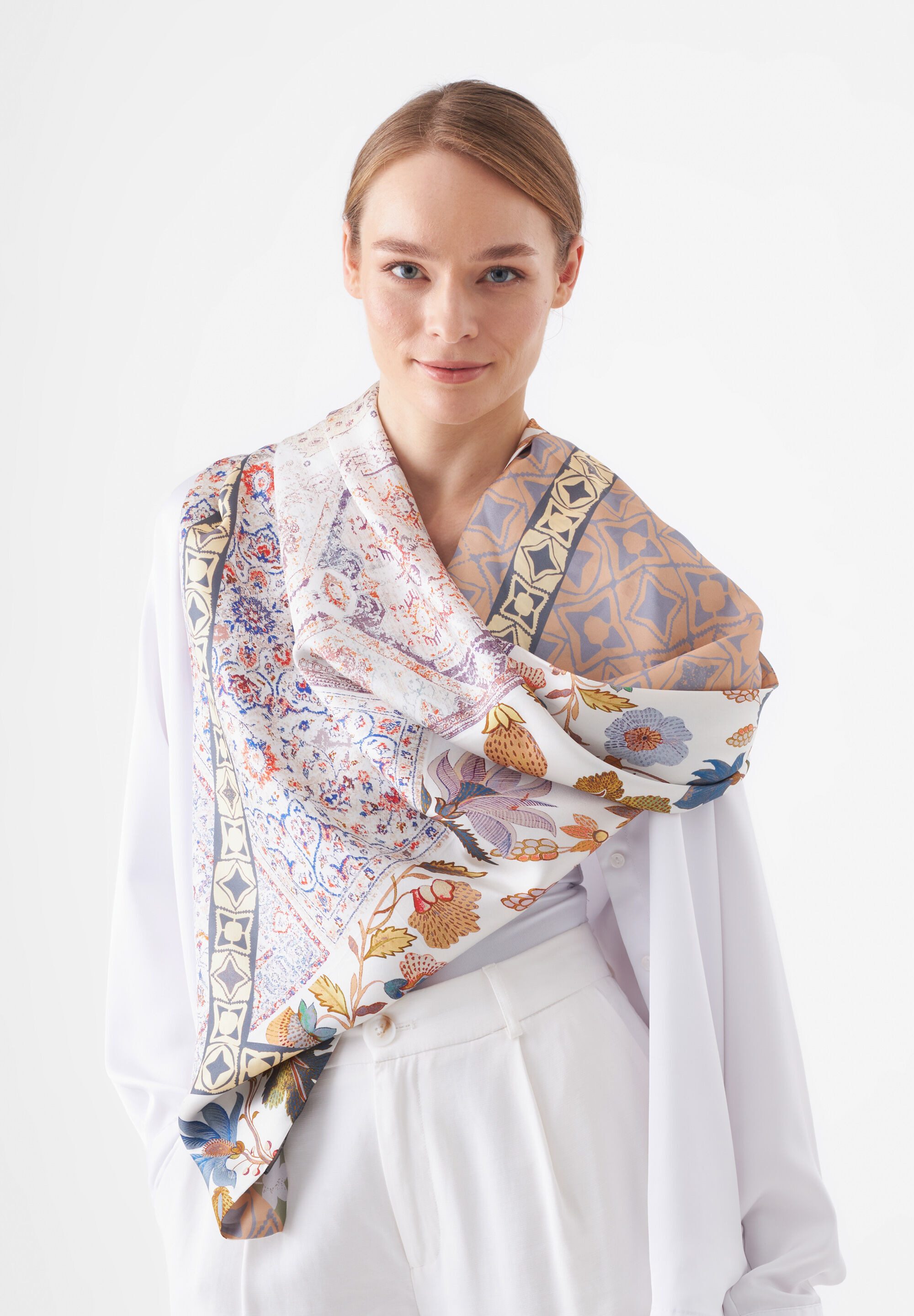 Du kannst dieses allover im Pattern-Mix bedruckte Dreieckstuch aus feinster Seide zur Jeansjacke so selbstverständlich wie zum Edel-Outfit tragen. Top geknotet oder um die Hüften geschwungen, wirkt das edle Triangel-Tuch aus # 1 PURE SILK besonders fashionable. Seide ist eine der kostbarsten, textilen Fasern der Welt. Wer sich für dieses hochwertige Naturmaterial entscheidet, setzt auf sehr einen exklusiven Look. Das Triangle wurde in einer ausgewählten, chinesischen Seidenmanufaktur, mit der uns eine langjährige Partnerschaft verbindet, aus wertvoller Seide gefertigt. Das Tuch besticht durch seinen angenehm kühlen und geschmeidig weichen Griff, sein luxuriöses Tragegefühl und seine einzigartige Farbbrillanz.