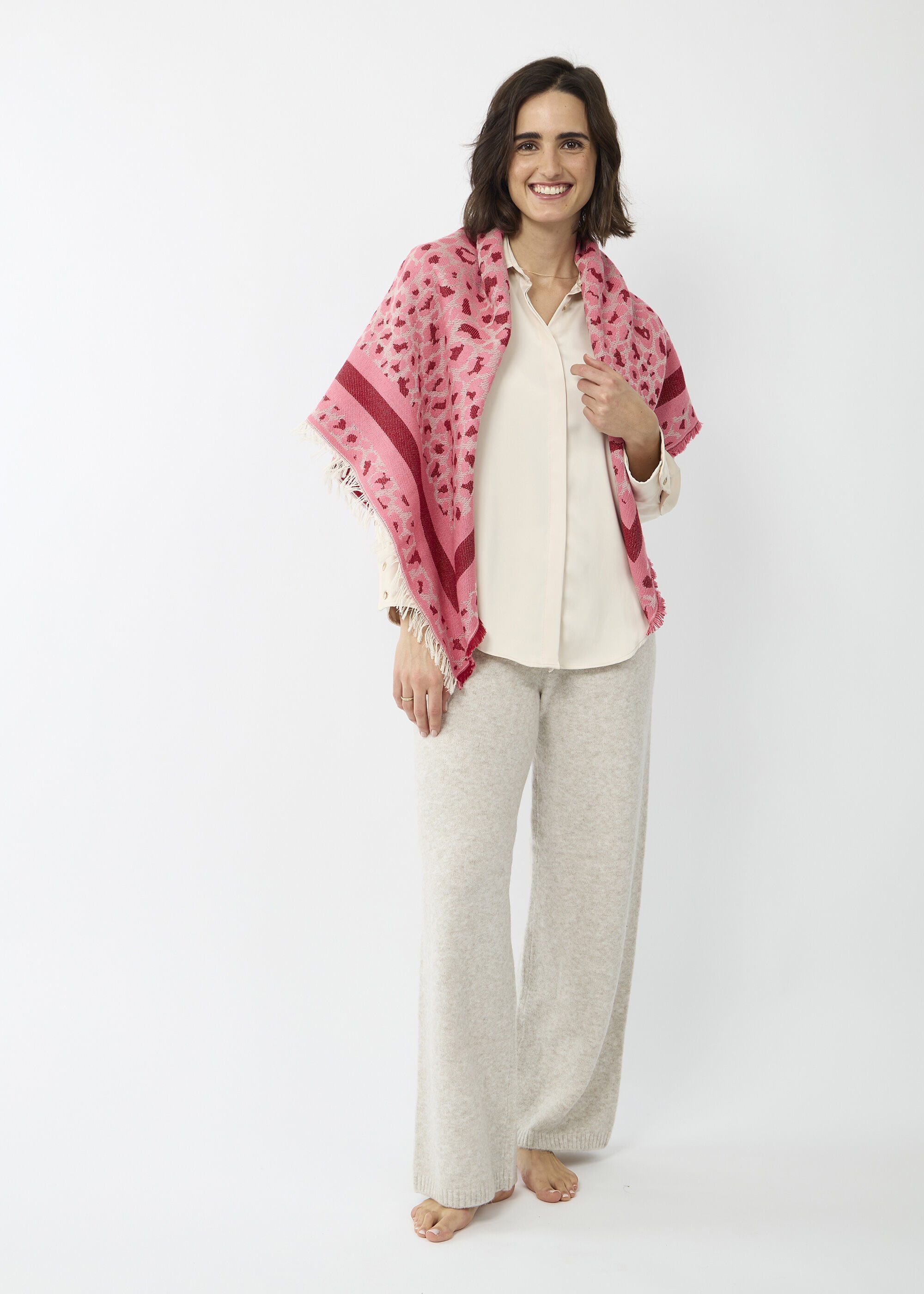 Dieses Jacquard-Tuch aus unserer exklusiven „Handmade Collection“ #9 SIGNATURE MIX ist mit viel Liebe zum schönen Detail gearbeitet. Das Tuch hat ein gewebtes Leo-Muster in Rosé, das an den Rändern auf einer Seite mit pinken und auf der anderen Seite mit roten Streifen akzentuiert ist. Es wurde in einer kleinen indischen Manufaktur gefertigt, wo die traditionelle Jacquard-Weberei eine lange Geschichte hat. Das Tuch ist warm und voluminös und besticht mit handwerklichem Look. Tipp: Die perfekt passenden Leo-Taschen findest du auch bei uns im Меню.