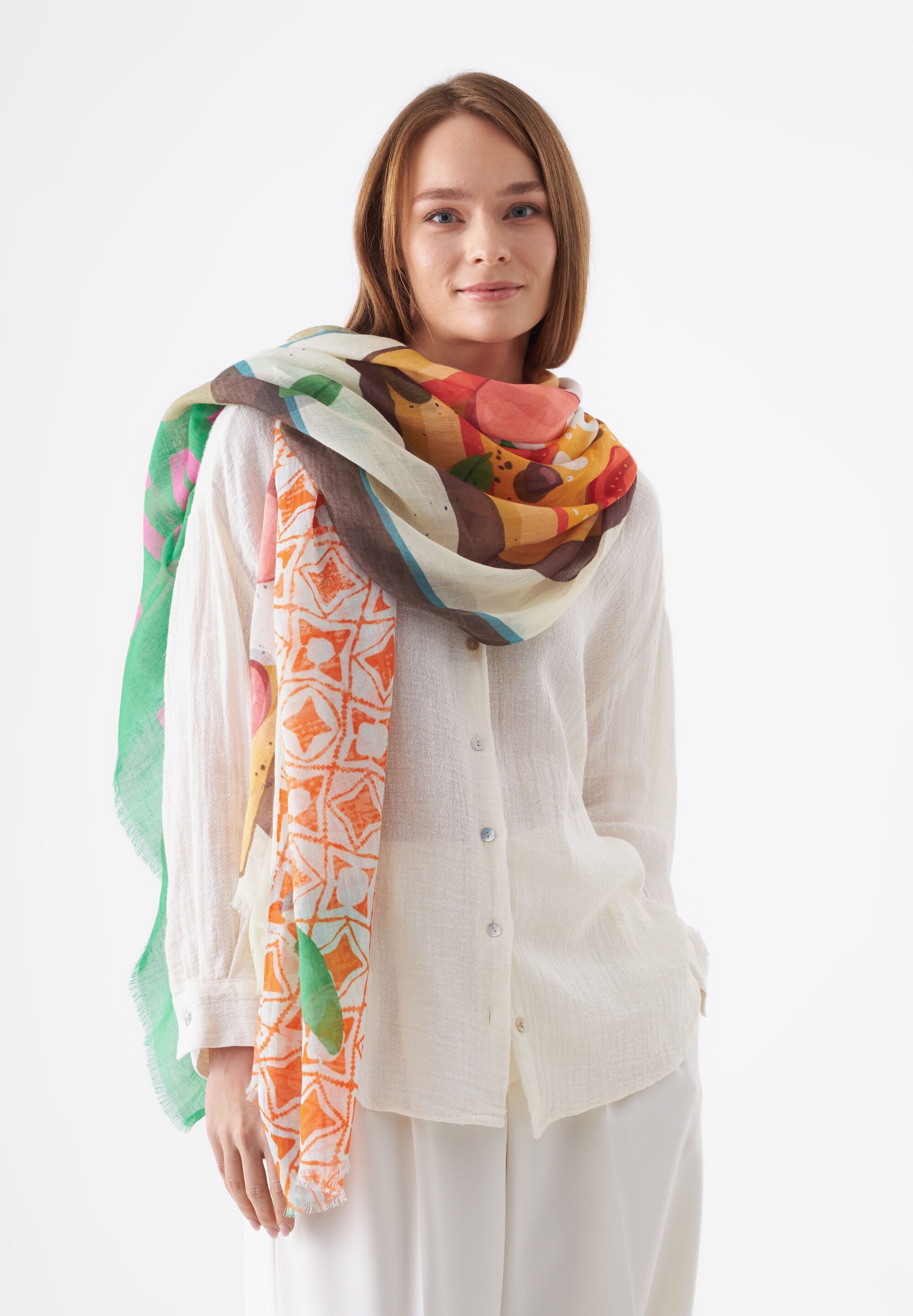 Statement-Schals mit coolen Food-Prints sind die neuen Fashion-Stars. So wie dieser XL-Schal aus softem Baumwoll-Mix, der mit plakativem Pizza-Print für Furore sorgt. Tipp: Am Beach oder Badesee kommt der sommerleichte Schal auch als Pareo toll zum Tragen.