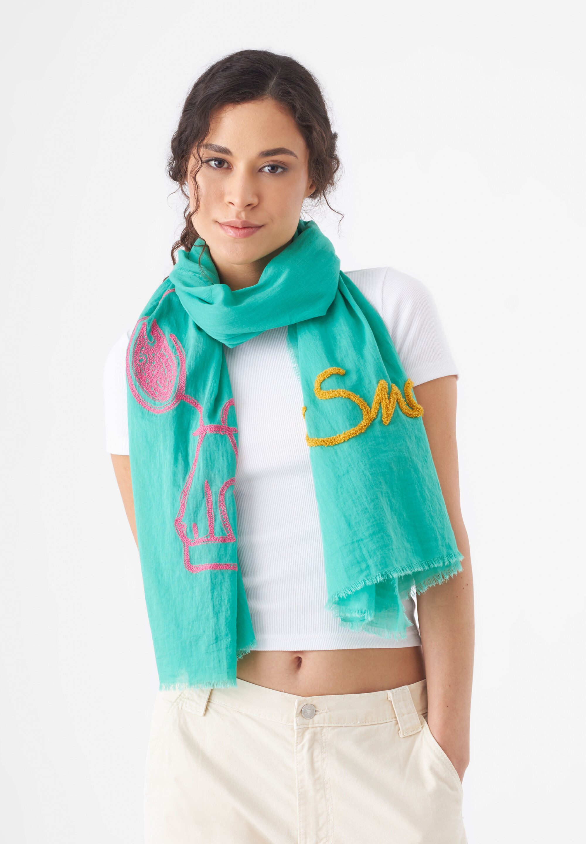 Die Peanuts™ werden 75! Grund genug, die Kultfiguren mit diesem ganz besonderen Schal zu feiern. Der sommerleichte Schal ist aus reiner Baumwolle gefertigt und mit einem großen Snoopy-Motiv in Teddy-Optik dekorativ bestickt. Uns gefällt er locker hängend besonders gut, weil der süße Snoopy so toll zur Geltung kommt.