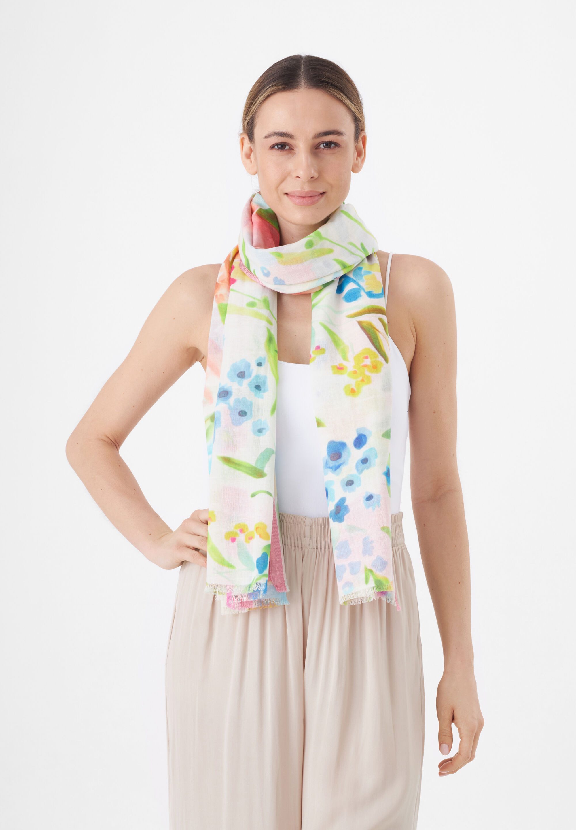 Sommer-Feeling pur. Der softweiche Schal aus Baumwolle und feinem Modalgarn beindruckt uns mit schönster Blütenpracht. Wie man den bunten Blumenschal erwachsen stylt? Wir finden ihn super zu Denim, weil dieser den verspielten Look bricht und dem Outfit Lässigkeit verleiht.
