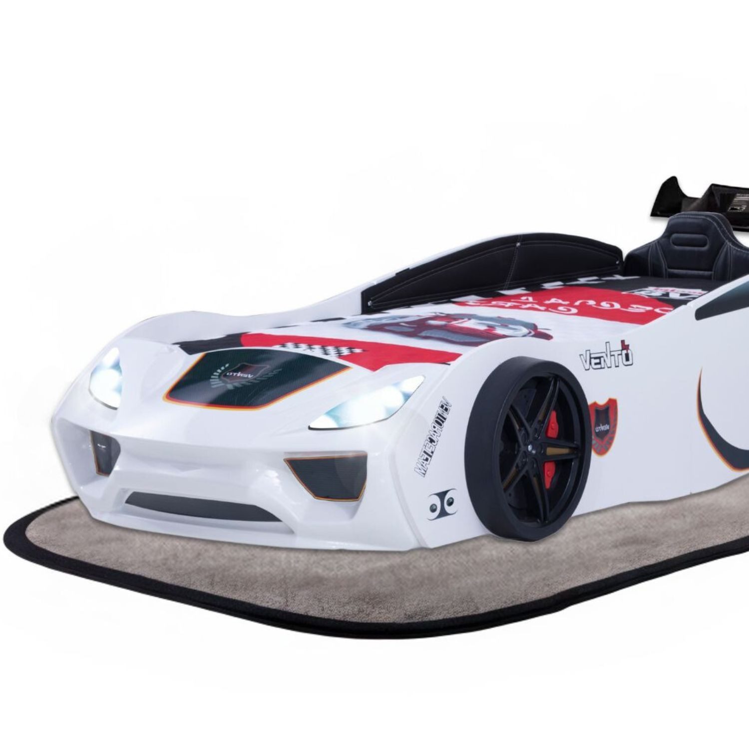 Lassen uns von der Rennstrecke träumen! Vento ist ein Autobett mit Sportausführung für Kinder. Das mitgelieferte Sportpack-Rückenpolster in klassischer Kunstlederausführung in Schwarz macht den Vento zu etwas ganz Besonderem. Die exklusive Ausführung mit gestepptem Polster lässt Kinderbett zum perfekten Modell für jedes Kinderzimmer werden. Dieses Auto-Kinderbett, das LED-Licht und schicke Aufkleber enthält, sorgt dafür, dass das Zuhause echtes Rennfahrer-Feeling bekommt. Das Bettgestell ist aus robustem Material gefertigt. Die massiven 18 mm Möbelplatten sind mit hochwertigen, antibakteriellen Kunststoffen laminiert. Durch die markante Front und den bulligen Spoiler ist ein echter PS-Bolide entstanden. Dieses Bett ergänzt das Rennwagenerlebnis mit LED-Frontscheinwerfern, die mit dem mitgelieferten Netzstecker eingeschaltet werden können. Der Vento Sport ist auch mit einem Racing-Design-Aufkleber ausgestattet. Das Bett ist in den Farben Rot und Weiß verfügbar. Ein maßgenauer und schnell einzulegender Rollrost für die Liegefläche von 90 x 200 cm ist in diesem Set enthalten.