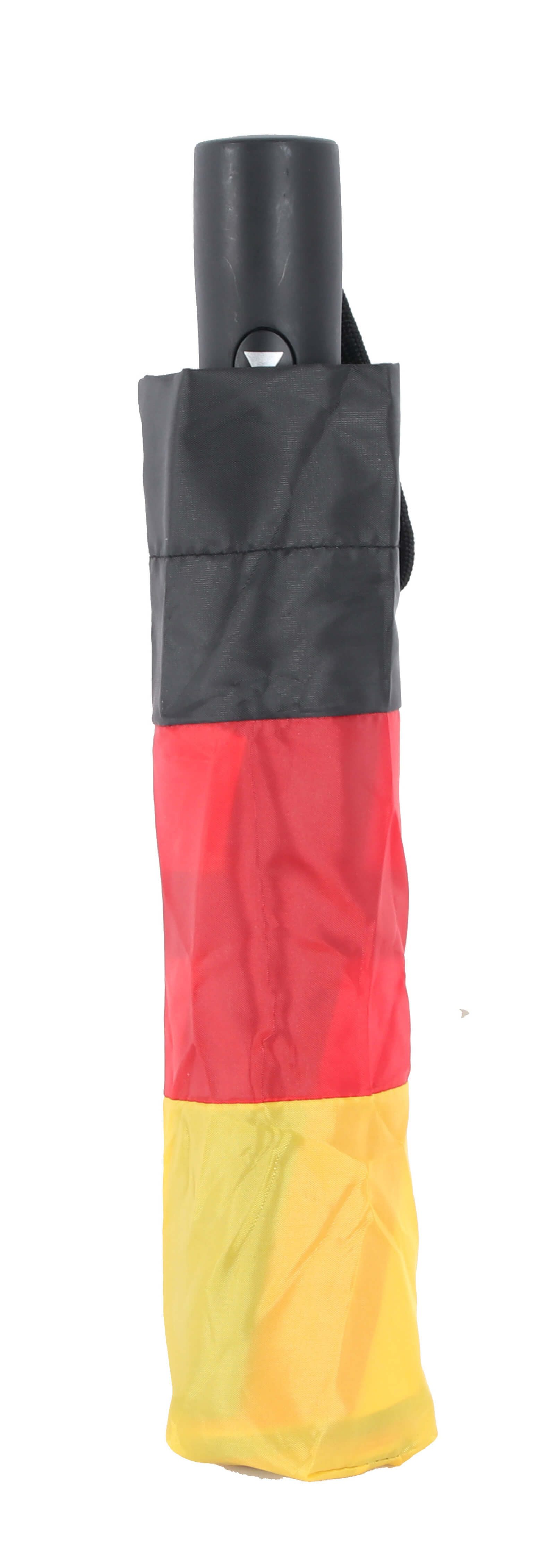 Der Schirm ist in den Farben Schwarz, Rot und Gelb gestaltet, den klassischen Deutschlandfarben.