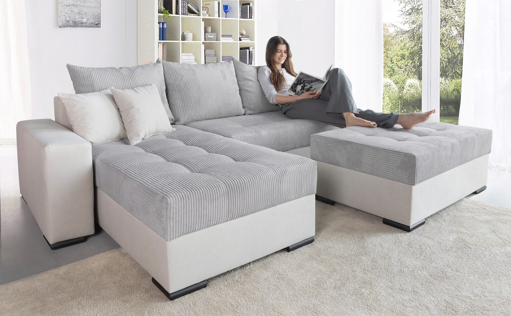 Wenn du Wert auf bequeme und langlebige Sitzmöbel legst, solltest du einen Blick auf dieses Ecksofa »Josy L-Form, B: 214 cm in Cord, Cord-Mix« von COLLECTION AB werfen. Er ist mit hochwertigem PUR-Schaumstoff gepolstert. Außerdem kann das Möbelstück ein separates Gästebett ersetzen und somit Platz einsparen, denn es ist mit einem praktischen Bettkasten versehen. Ein weiterer Vorteil ist das passende Rückenkissen, die das Sofa noch komfortabler machen. Sowohl rechts als auch links kann die Ottomane montiert werden. Die Microfaser PRIMABELLE® zeichnet sich durch feine Fasern und gute Pflegeeigenschaften aus. Aus Liebe zum Detail wurde dieses Modell von Hand angefertigt.