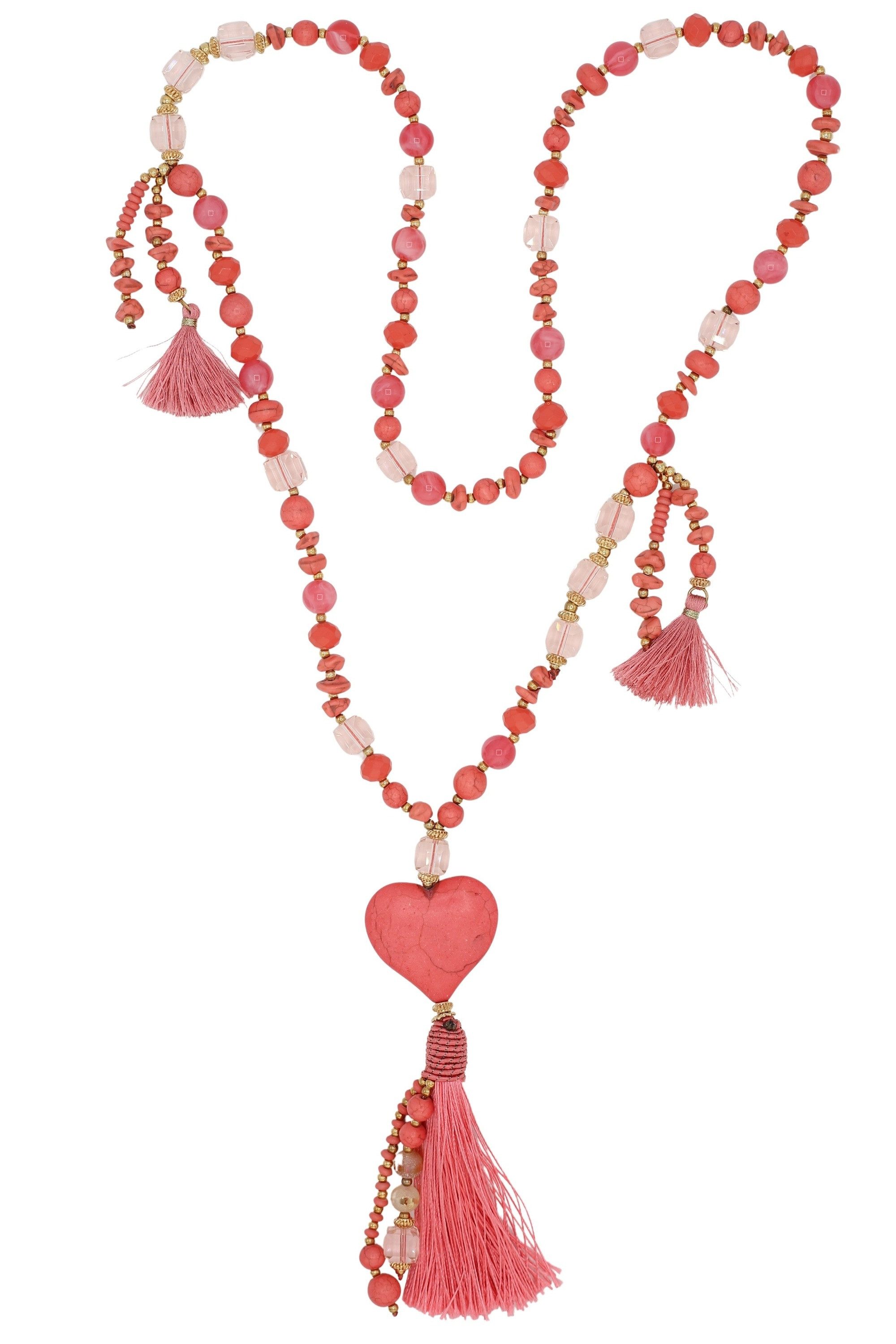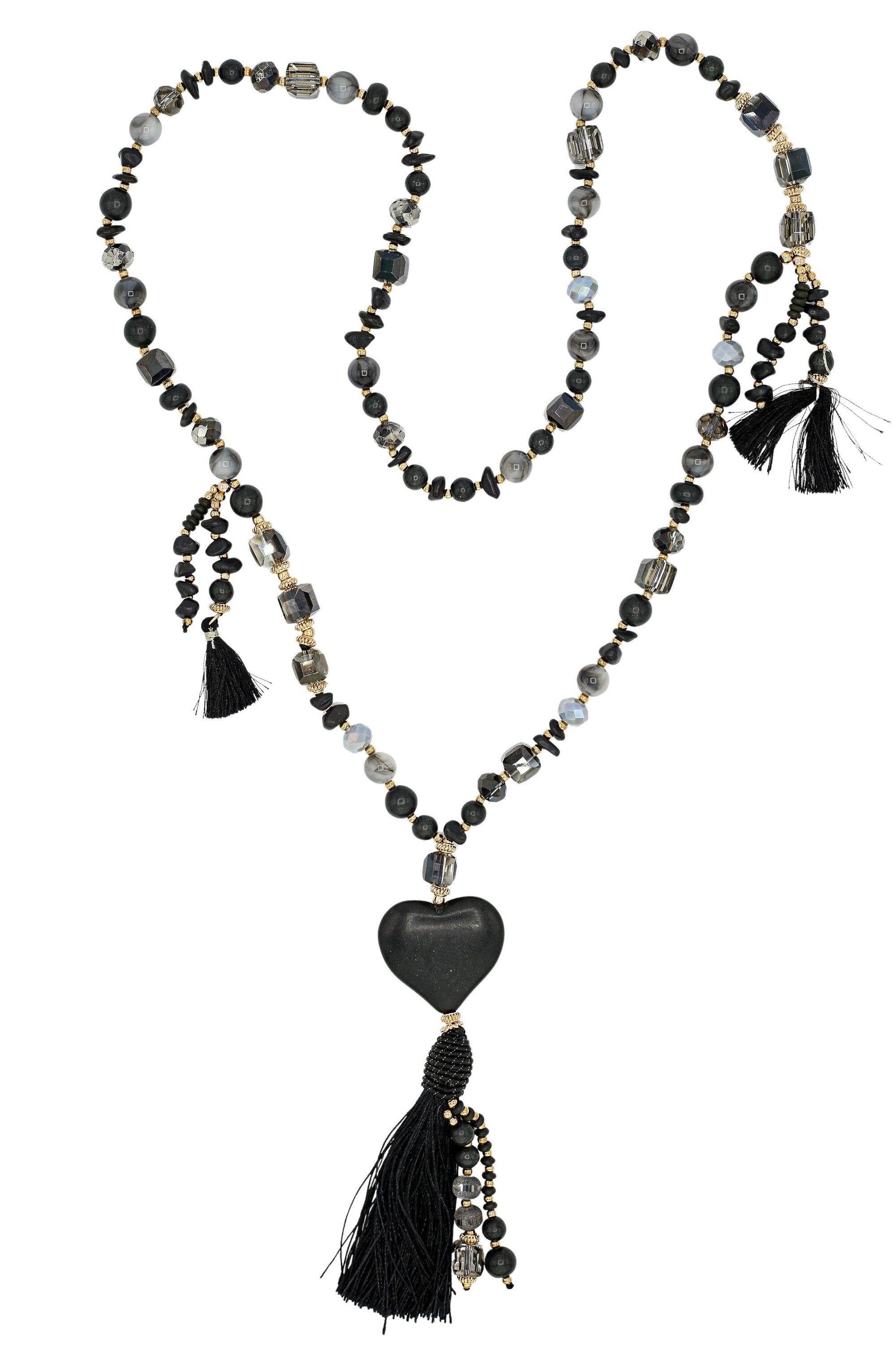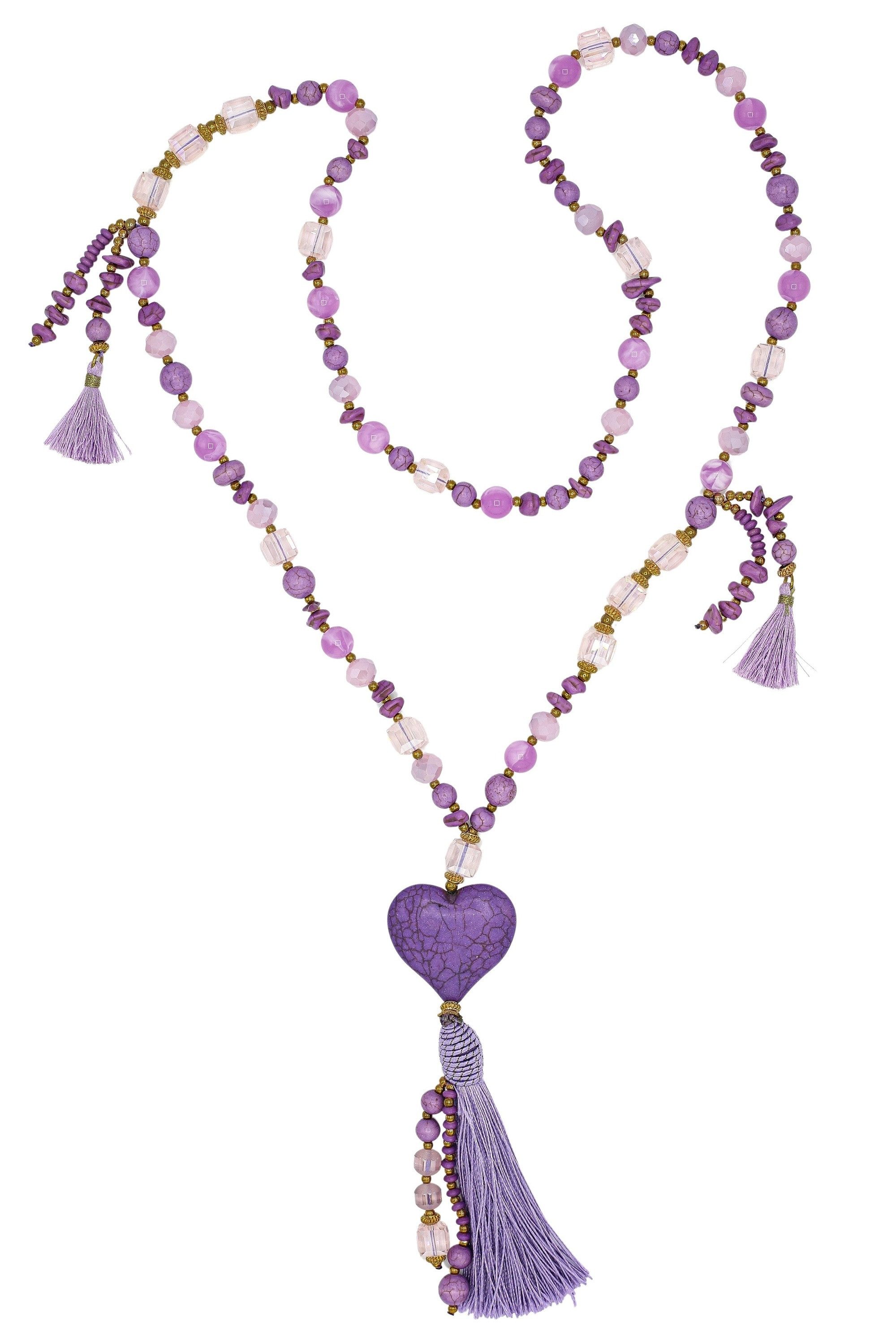 Diese stilvolle, lange Halskette ohne Verschluss besticht durch ihr harmonisches Farbspiel aus hochwertigen Stein- und Glasperlen in Kombination mit glänzenden goldfarbenen Metallelementen und einer charmanten Quaste, die das Herzstück der Kette, einen edlen, marmorierten Herzanhänger, elegant ergänzt, während die großzügige Длина von 92 cm und die zusätzliche 15,5 cm lange Anhänger-Quasten-Kombination ein luxuriöses, modernes und dennoch verspieltes Design schaffen, das sich sowohl für den Alltag als auch für besondere Anlässe perfekt eignet, in den Farbvarianten Lachs, Lila und Schwarz erhältlich und ein echtes Highlight für alle, die außergewöhnliche Accessoires lieben, zudem hautfreundlich, da nickel-, kadmium- und bleifrei, und ideal als Geschenk oder persönliches Statement-Piece, um jedem Outfit einen Hauch von Boho-Chic und Glamour zu verleihen.