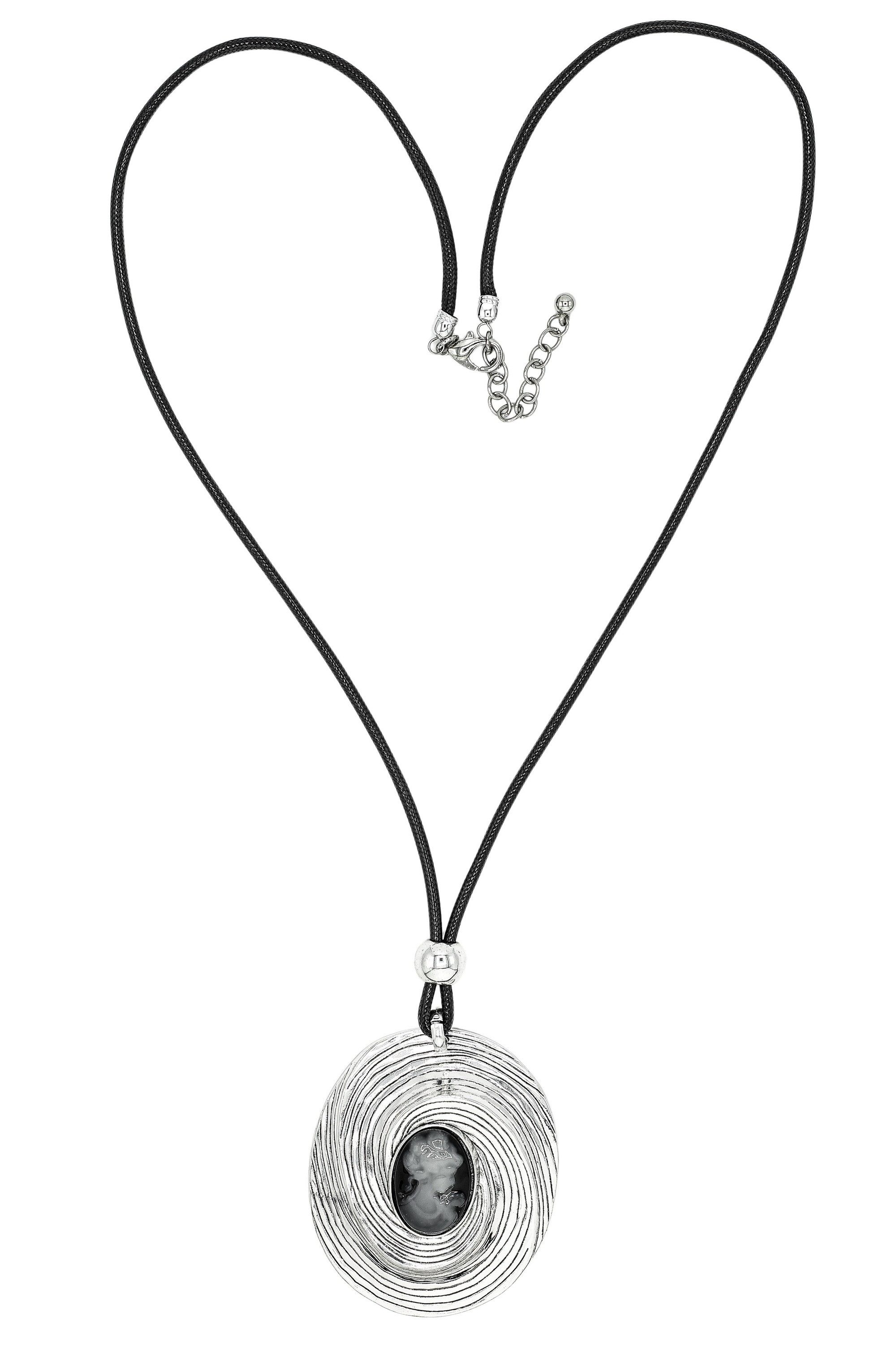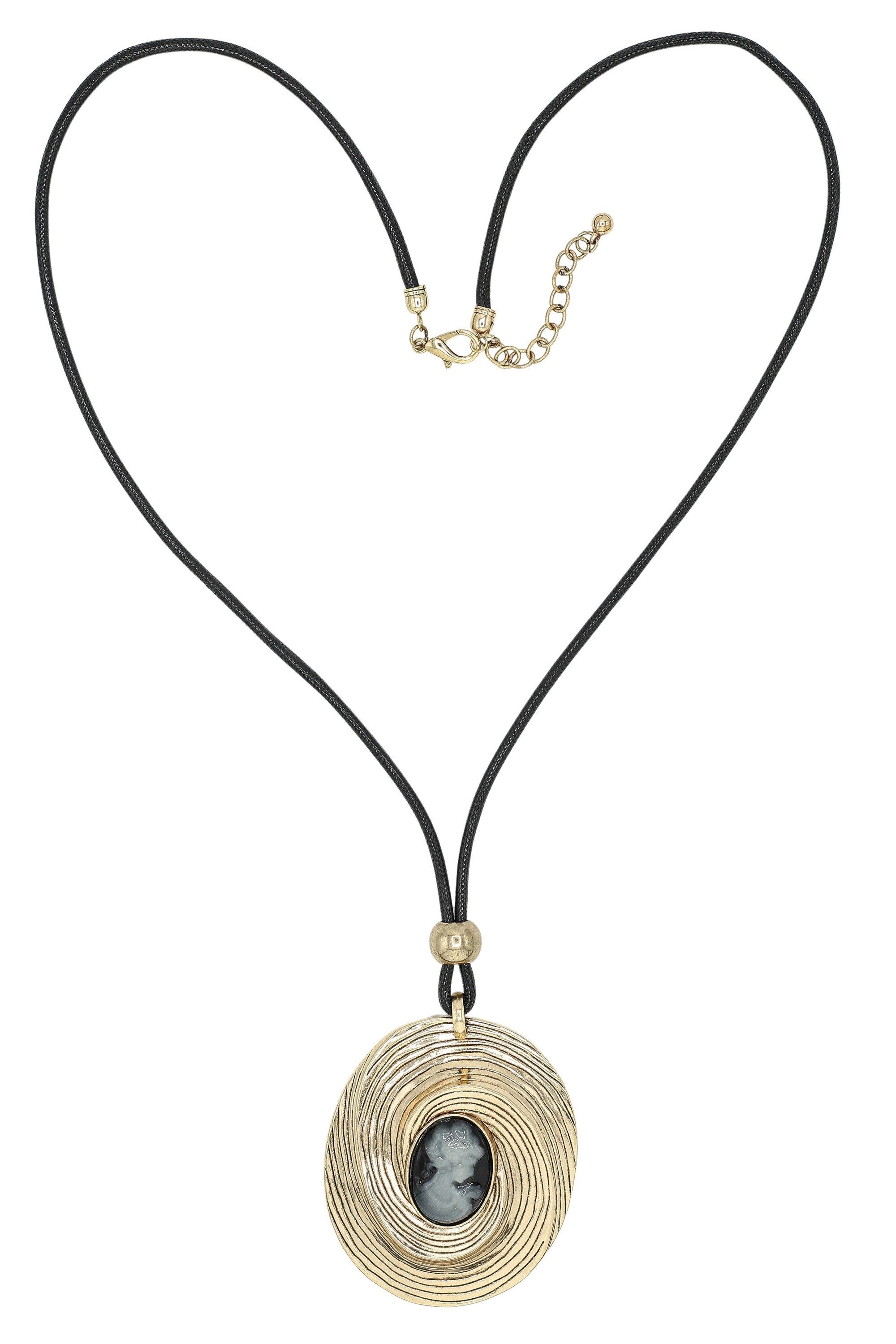 Diese stilvolle lange Kette vereint klassische Eleganz mit modernem Design. Der große, ovale Anhänger mit kunstvoller Gemme ist ein echter Blickfang und verleiht jedem Outfit einen Hauch von Vintage-Flair. Die feine Struktur des Metalls setzt sich in geschwungenen Linien fort und umrahmt die detailreiche Gemme auf edle Weise. Das lange Textilband sorgt für angenehmen Tragekomfort und betont die lässige Eleganz dieser Halskette. Dank des Karabinerverschlusses mit Verlängerungskette kann die Длина individuell angepasst werden. Perfekt als Statement-Piece zu schlichten Oberteilen oder als stilvolles Accessoire für besondere Anlässe.