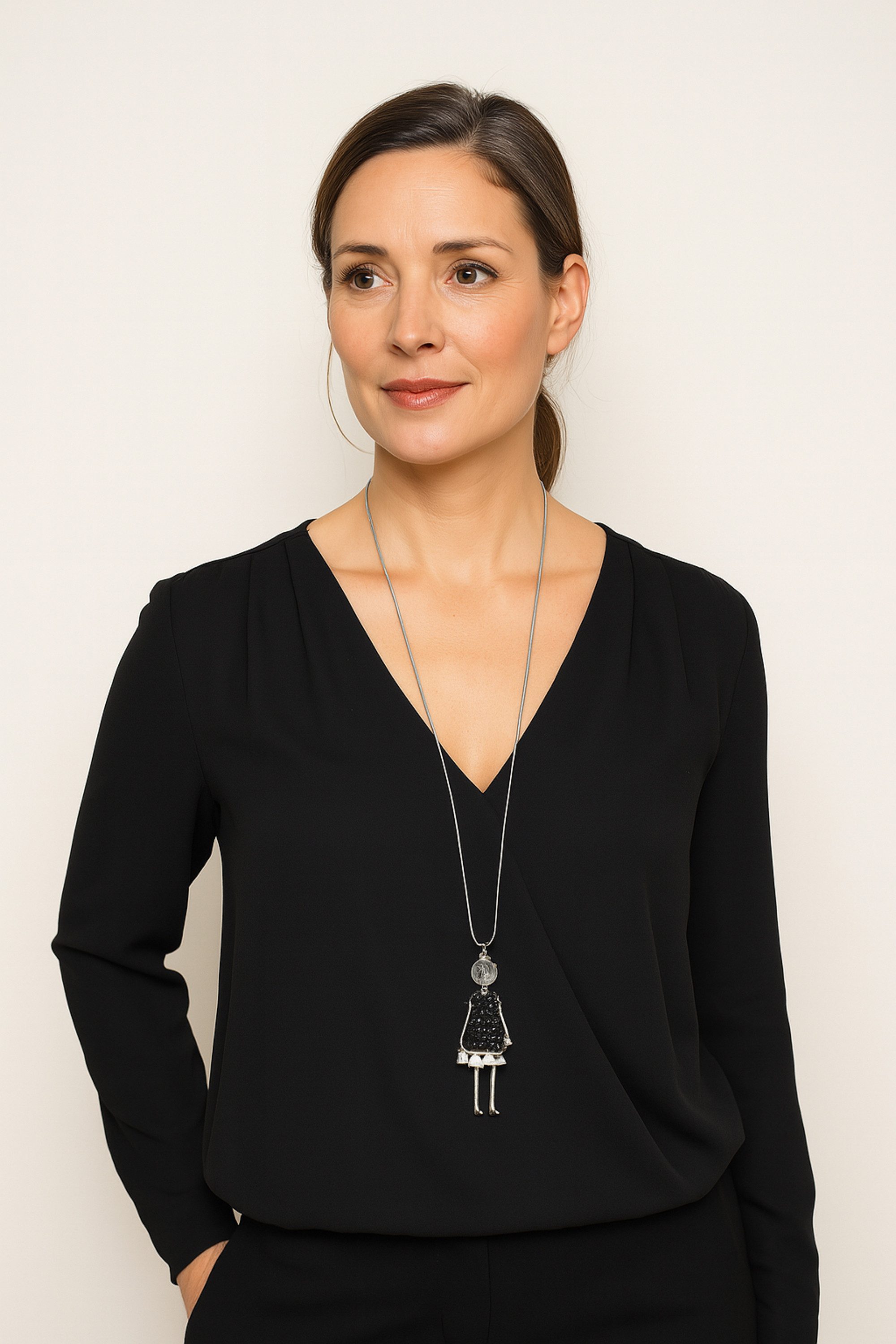 Diese lange Halskette mit einer Длина von 92?cm plus Verlängerungskette ist ein modisches Statement für alle, die das Besondere lieben: Der auffällige Anhänger in Form einer stilisierten Modepuppe ist mit einem facettierten Kristallkopf, einem Kleid aus schwarzen Perlen und kleinen weißen Details am Saum sowie einer silberfarbenen Handtasche ausgestattet – ein echtes Schmuckstück mit Humor und Stil. Die detailverliebte Figur hängt an einer feinen silberfarbenen Schlangenkette, die angenehm leicht und geschmeidig fällt. Der Kontrast zwischen den dunklen und hellen Elementen verleiht der Kette einen eleganten und zugleich spielerischen Look. Ob zur Bluse im Büro, zum schlichten Kleid oder zum gemütlichen Pullover – dieses Accessoire zieht alle Blicke auf sich und bringt Individualität in jedes Outfit. Die hochwertige Verarbeitung und die kreative Gestaltung machen die Kette zu einem idealen Geschenk für modebewusste Frauen mit einem Faible für kreative Details. Durch den Karabinerverschluss mit Verlängerung lässt sich die Длина flexibel anpassen, sodass sie sich optimal in jedes Styling integrieren lässt. Diese Modepuppe begleitet dich charmant durch den Tag – frech, feminin und absolut unverwechselbar.