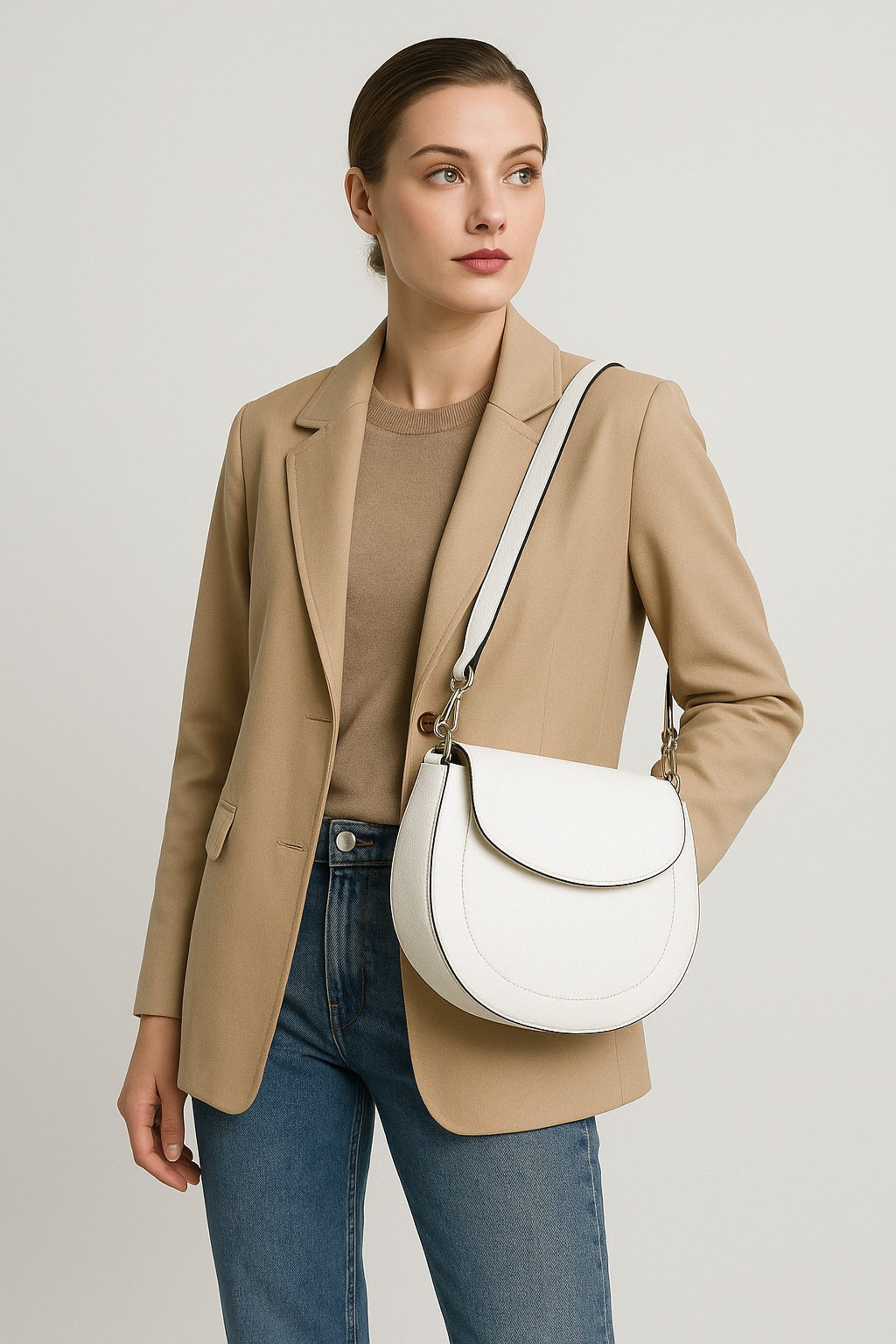 Diese elegante Schultertasche in modern geschwungener Form überzeugt durch ihre klare Linienführung und das hochwertige weiße Leder, das durch schwarze Kanten stilvoll akzentuiert wird. Mit zwei austauschbaren Trageriemen – einem breiten kurzen für die Schulter und einem langen für den Crossbody-Look – bietet sie Flexibilität und Komfort im Alltag. Beide Riemen lassen sich dank silberfarbener Karabinerhaken ganz leicht abnehmen und auswechseln. Der Überschlagverschluss mit Magnet hält den Inhalt sicher, während das Innere durchdacht gestaltet ist: Zwei große Hauptfächer sowie ein separates Reißverschlussfach sorgen für Ordnung und schnellen Zugriff. Der strukturierte Look des Leders in Kombination mit der präzisen Nahtführung und den dezenten Metallbeschlägen verleiht dieser Tasche einen besonders hochwertigen, urbanen Charakter. Die klaren Kontraste und das edle Material machen sie zur perfekten Begleiterin für den Alltag wie für besondere Anlässe. Ob im Business, beim Stadtbummel oder im Café – mit dieser Tasche zeigst du Stilgefühl und Klasse. Trotz ihrer kompakten Размер bietet sie ausreichend Platz für Smartphone, Portemonnaie, Schlüssel und kleine Essentials. Das cleane Design in Weiß mit schwarzen Akzenten passt sich zahlreichen Outfits an – von der monochromen Kombination bis zum farbigen Statement-Look. Ideal für Frauen, die sowohl praktische Funktionalität als auch einen modischen Auftritt schätzen.