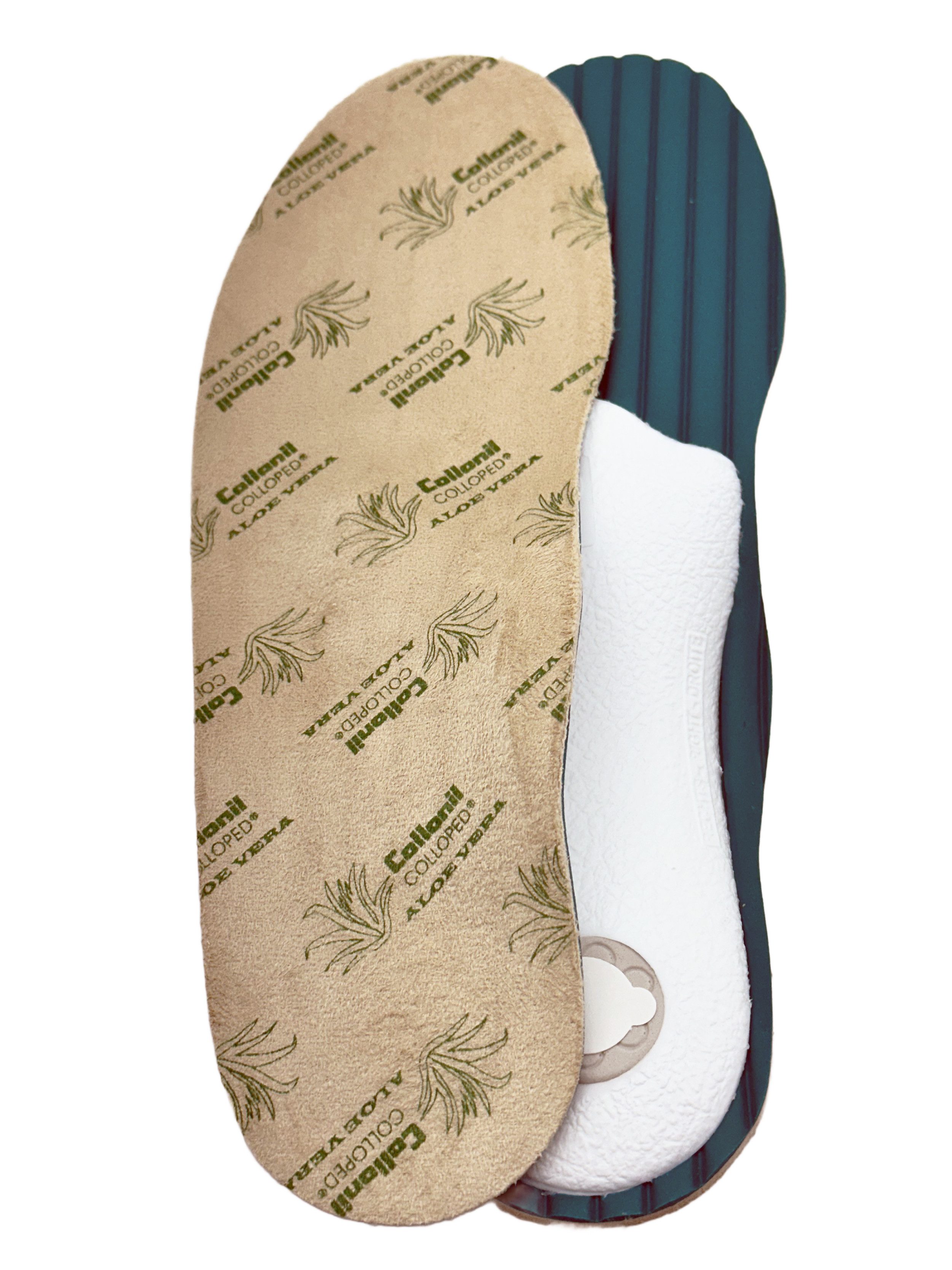 - Diese Sohle ist mit Aloe Vera imprägniert, die bekannt für ihre feuchtigkeitsspendenden und beruhigenden Eigenschaften ist.