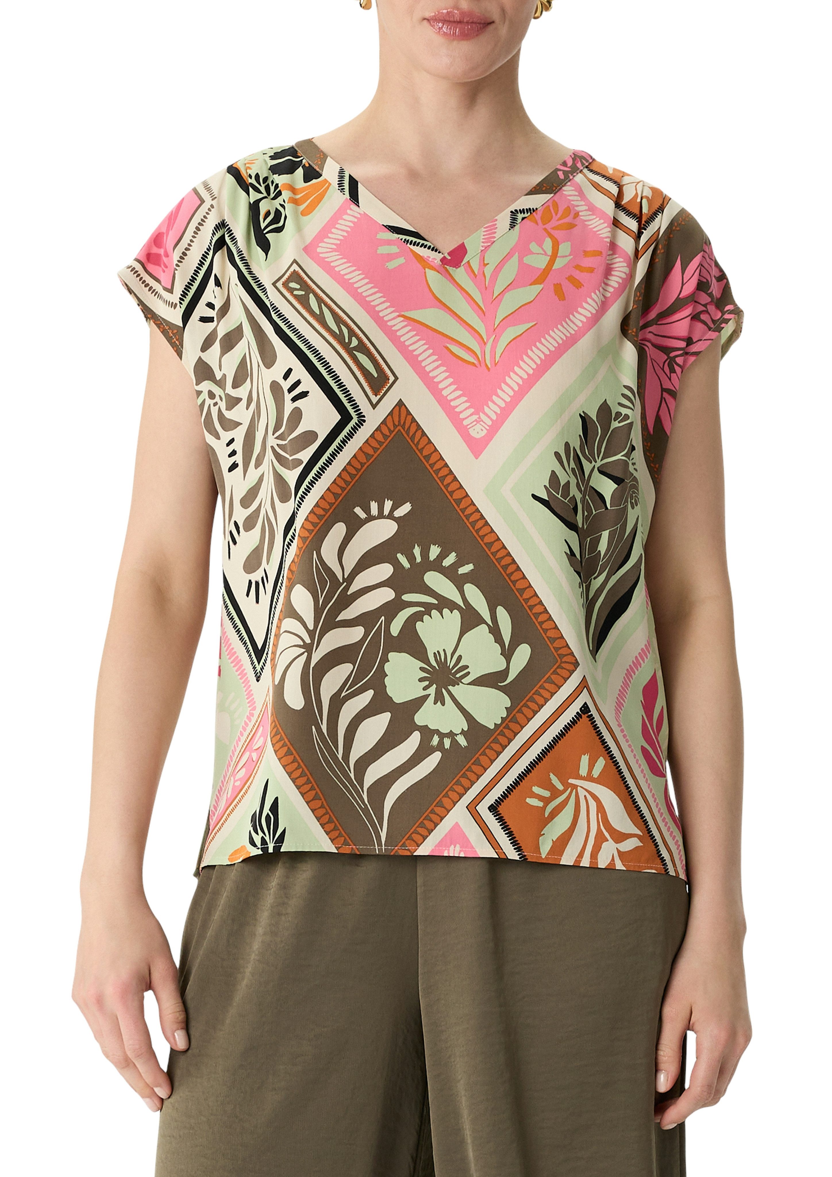 Die Shirtbluse von Comma ist sowohl bei schicken Anlässen als auch im Büro eine gute Option. Sie wirkt mit dem Markenlabel und dem Print sowohl locker als auch frisch. Diese Bluse hat einen V-Ausschnitt und ist taillenbedeckend sowie basic geschnitten und umspielt deinen Oberkörper locker.