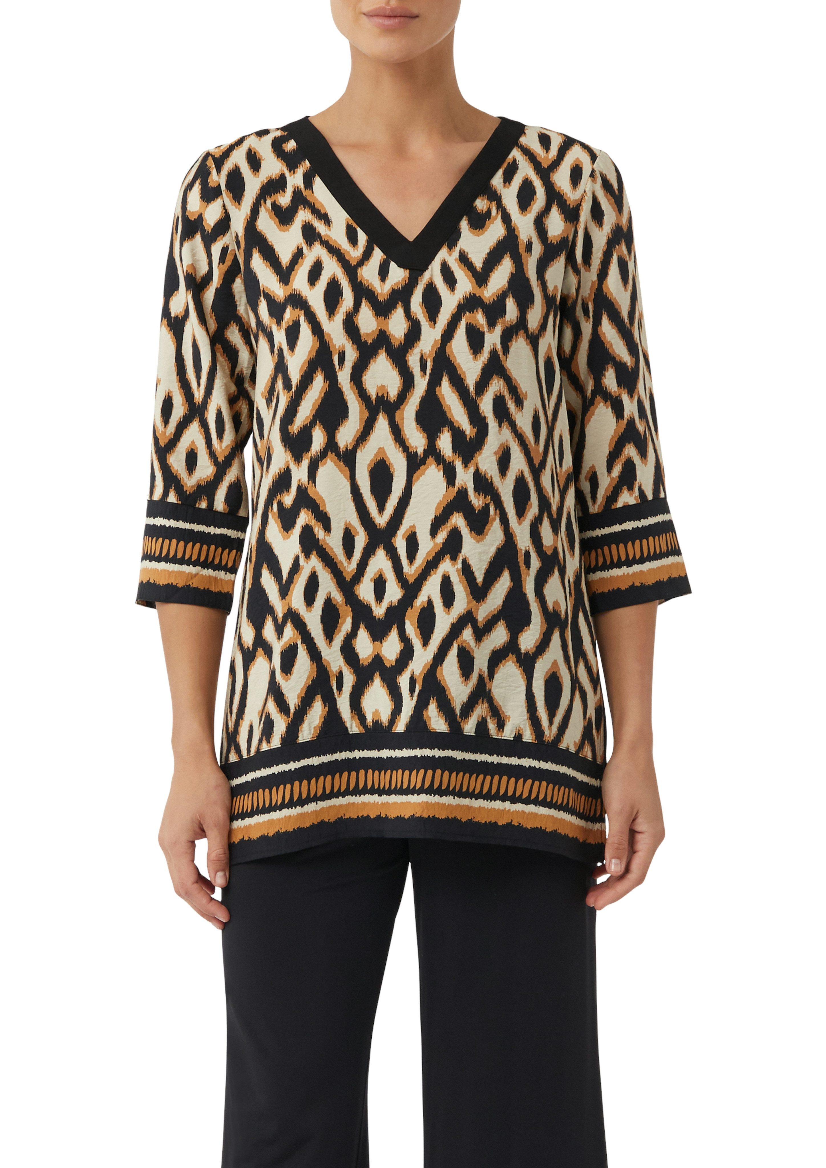 Die Klassische Bluse von Comma ist eine unkomplizierte Antwort auf die Frage "Was ziehe ich bloß zum Business-Meeting an?". Mit dem Markenlabel und dem Print sieht sie sowohl locker als auch frisch aus. Diese Bluse hat einen V-Ausschnitt und ist Po-bedeckend sowie basic geschnitten und umspielt deinen Oberkörper locker.
