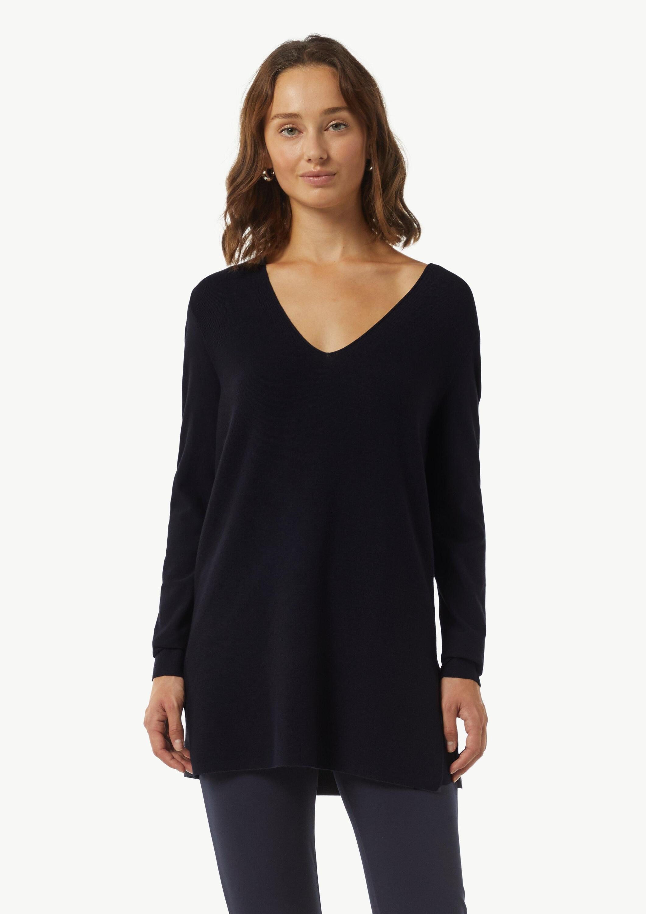 Schnittform Длина | Langer Feinstrickpullover mit seitlichen Schlitzen |