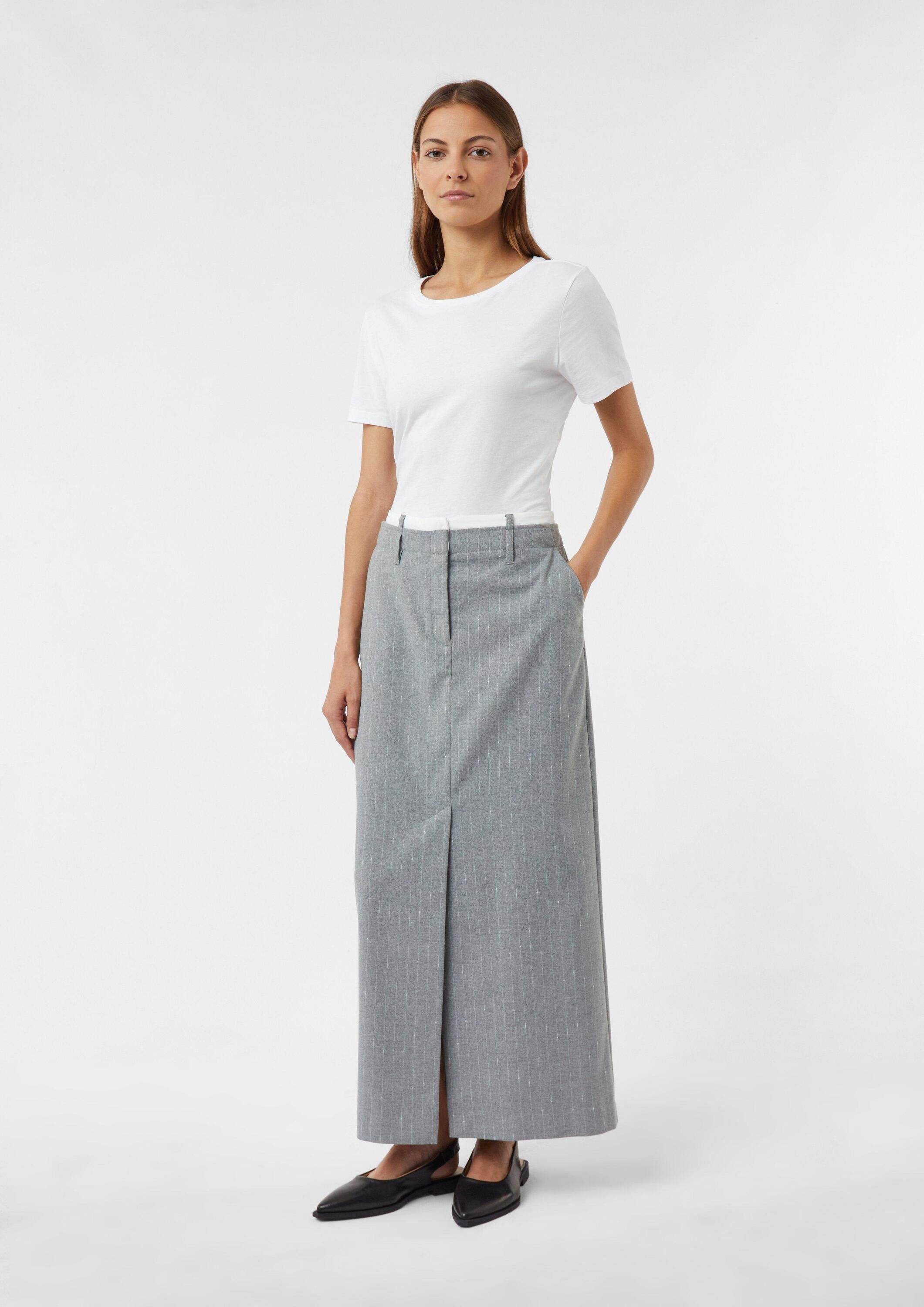 Schnittform Длина | Langer Nadelstreifenrock mit angesetztem Kontrastbund |