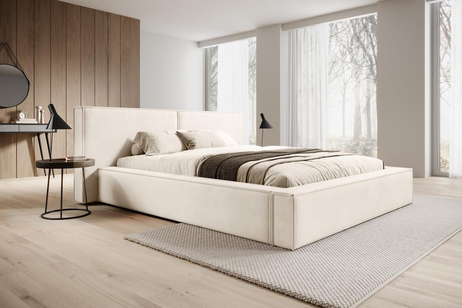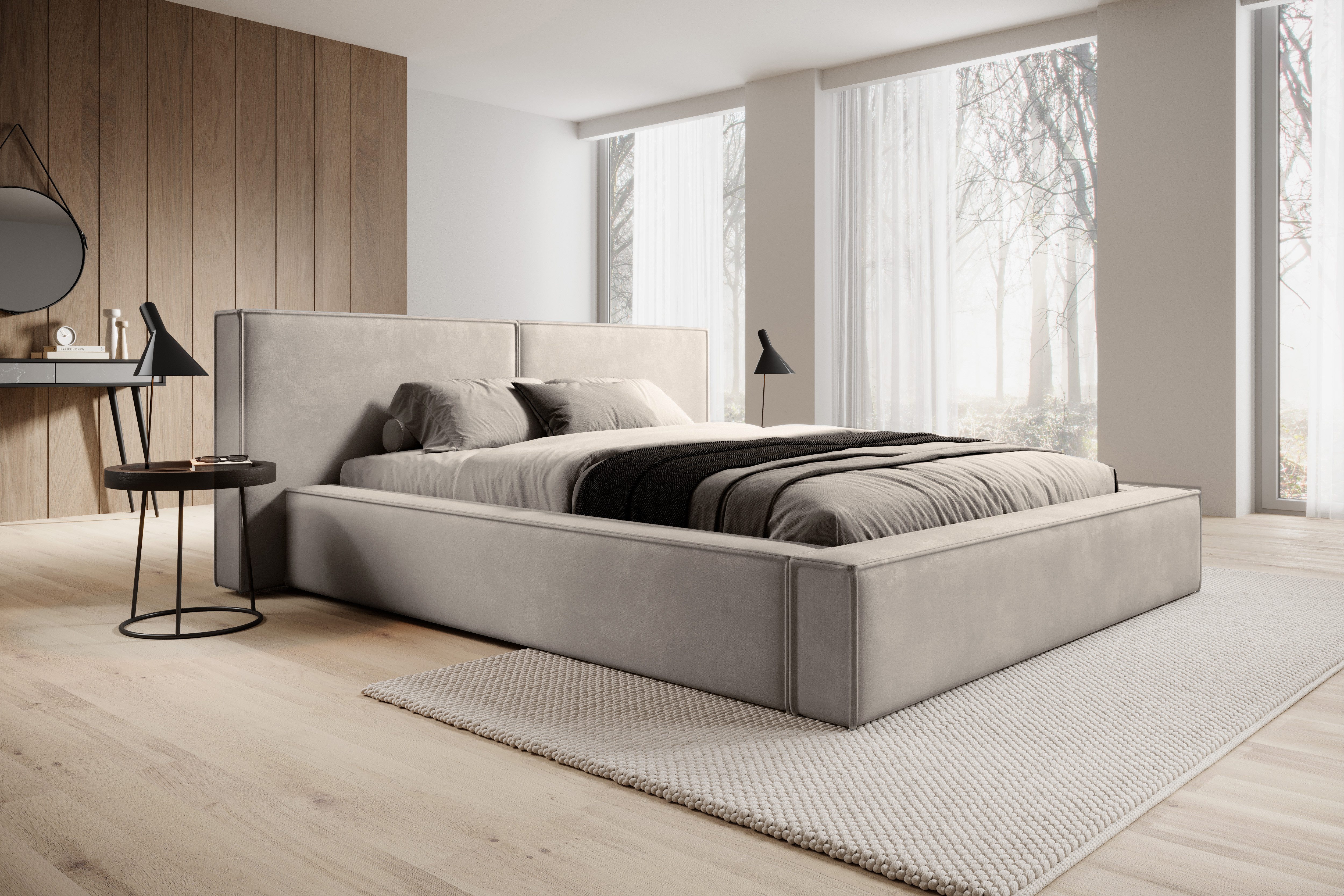 Das Bett zeichnet sich durch eine minimalistische Form und klare Linien aus, die ihm einen zeitlosen Charakter verleihen. Das hohe, rechteckige Kopfteil, das mit einem weichen Stoff bezogen ist, bildet einen eleganten Hintergrund für die Schlafzimmergestaltung und passt perfekt zu den aktuellen Einrichtungstrends.