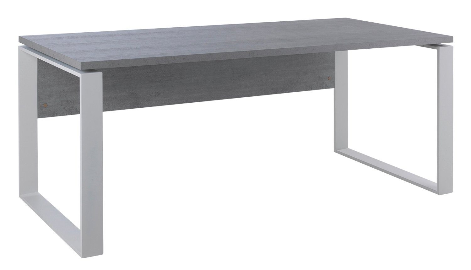 Lust auf den minimalistischen Industrie-Look? Der Schreibtisch macht den Anfang. Die Tischplatte in Beton-Grau besteht aus Dekor, das Gestell, sprich die Tischbeine aus weißem Metall. Das macht den Schreibtisch besonders robust und standsicher. Die Farbkombination aus Grau und Weiß wirkt schlicht, aber nicht langweilig. Durch die Betonoptik der Platte zieht Industrie-Flair in Ihre Wohnung ein. Mit dem Stellmaß von 170x75x80 cm bietet der Tisch ausreichend Platz für ein angenehmes Arbeiten. Auch darunter lässt sich praktischerweise noch der passende Rollcontainer aufstellen - Dieser bietet zusätzlich Stauraum für Material und Utensilien. Wer auch bei seinem Arbeitstisch gern auf ein innovatives Design setzen möchte, liegt mit dem Schreibtisch genau richtig!
