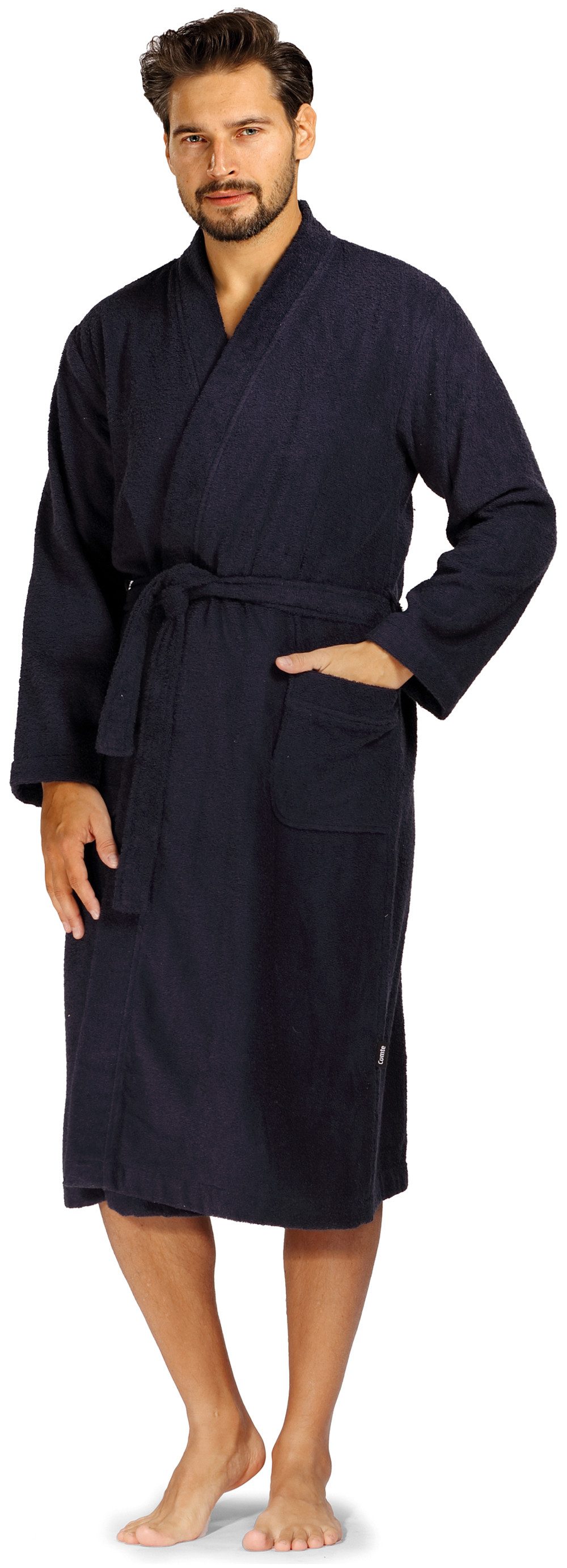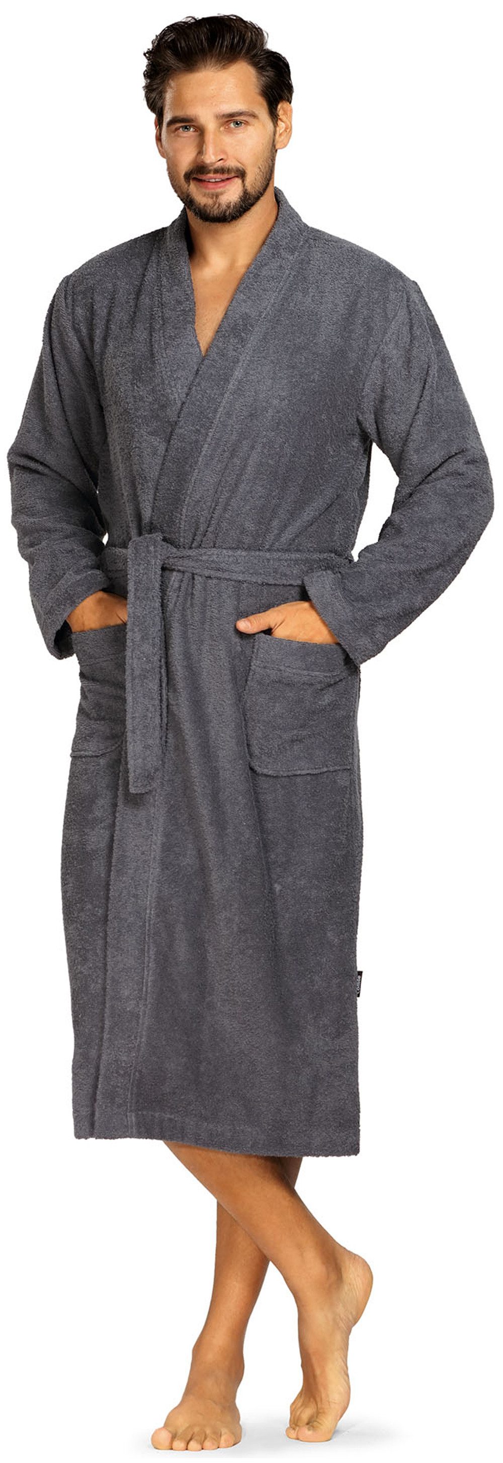Dieser Herren-Bademantel ist aus 100% Baumwolle gefertigt und bietet durch seine Walkfrottier-Qualität einen besonders weichen und saugfähigen Stoff, ideal für den Einsatz nach dem Duschen oder Baden. Der Mantel ist in einer Kimono-Form gestaltet und zeichnet sich durch seine schlichte, offene Schnittform ohne Kragen aus, die Bewegungsfreiheit bietet und einfach an- und auszuziehen ist.