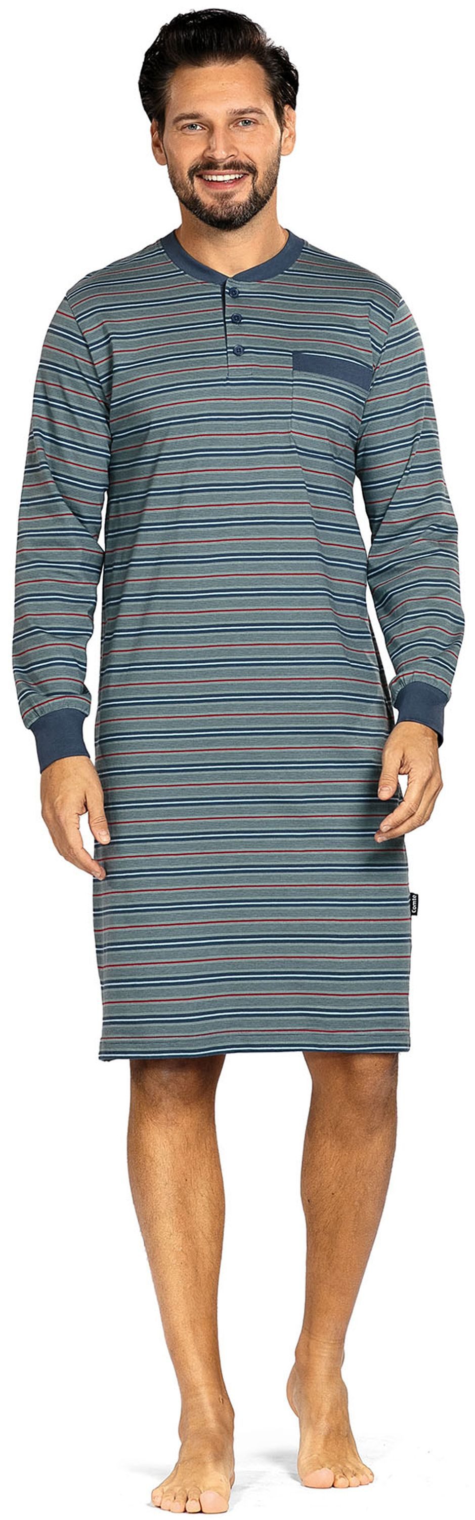 Das Nachthemd überzeugt durch ein schlichtes, aber stilvolles Streifendesign, das dem klassischen Schnitt eine moderne und frische Note verleiht. Die langen Ärmel sind mit elastischen Bündchen versehen, die für behagliche Wärme sorgen und gleichzeitig einen perfekten Sitz gewährleisten, ohne zu drücken. Die praktische Knopfleiste an der Vorderseite erleichtert das An- und Ausziehen und verleiht dem Nachthemd eine klassische, fast hemdenartige Optik.
