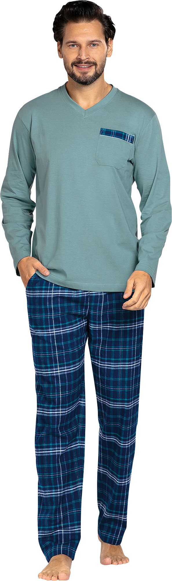 Comte Single-Jersey/Flanell Herren-Schlafanzug. Er verbindet Stil und Wohlgefühl. Das unifarbene Oberteil aus weichem Single-Jersey ist mit einem V-Ausschnitt versehen und besitzt eine Brusttaschen-Blende in Kontrastfarbe. Diese greift das buntgewebte Karomuster der flauschig angerauten Flanellhose auf. Die Hose verfügt über zwei praktische Eingriffstaschen und bietet durch den abgesteppten Gummibund einen bequemen Sitz. Genießen Sie zwei beliebte Qualitäten, die Sie mit angenehmem Tragekomfort und einer optimalen Passform verwöhnen. Hautfreundliche, atmungsaktive Qualität.