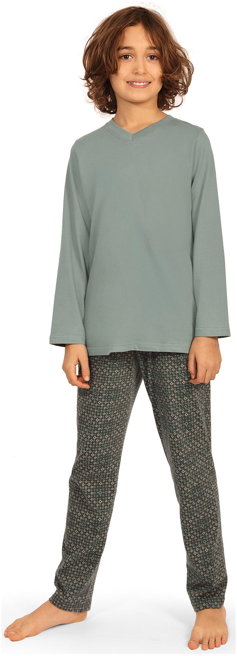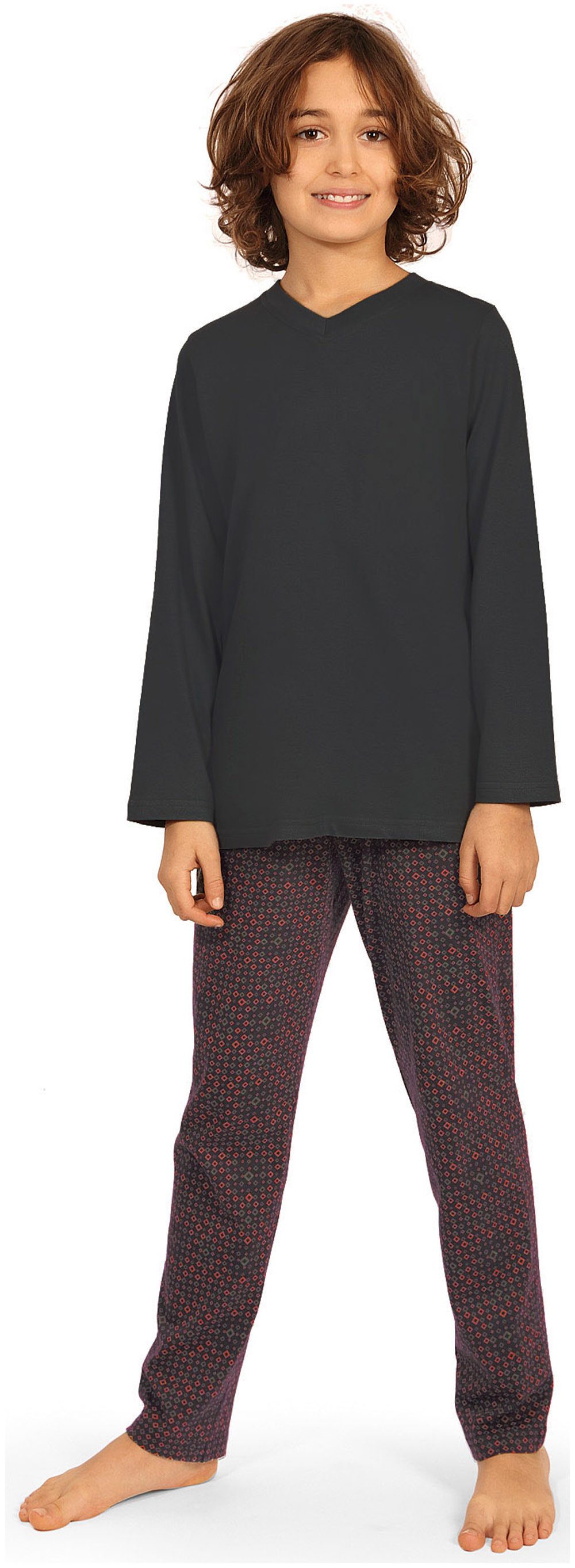 Der Jungen-Schlafanzug besteht aus hochwertiger Baumwolle und bietet optimalen Komfort während des Schlafens. Das Set umfasst ein Oberteil mit langen Ärmeln und eine Hose mit einem lebendigen Alloverprint. Das Oberteil verfügt über einen klassischen V-Ausschnitt, der dem Schlafanzug eine stilvolle Note verleiht. Die langen Ärmel sorgen für angenehme Wärme und Gemütlichkeit, besonders in den kühleren Nächten.