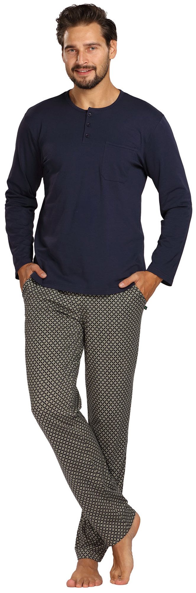Erleben Sie maximalen Komfort und modernen Stil mit diesem langen Herren-Schlafanzug. Hergestellt aus einer hochwertigen Mischung aus 95% Baumwolle und 5% Elasthan in weicher Single-Jersey-Qualität, bietet er angenehme Bewegungsfreiheit und eine perfekte Passform.