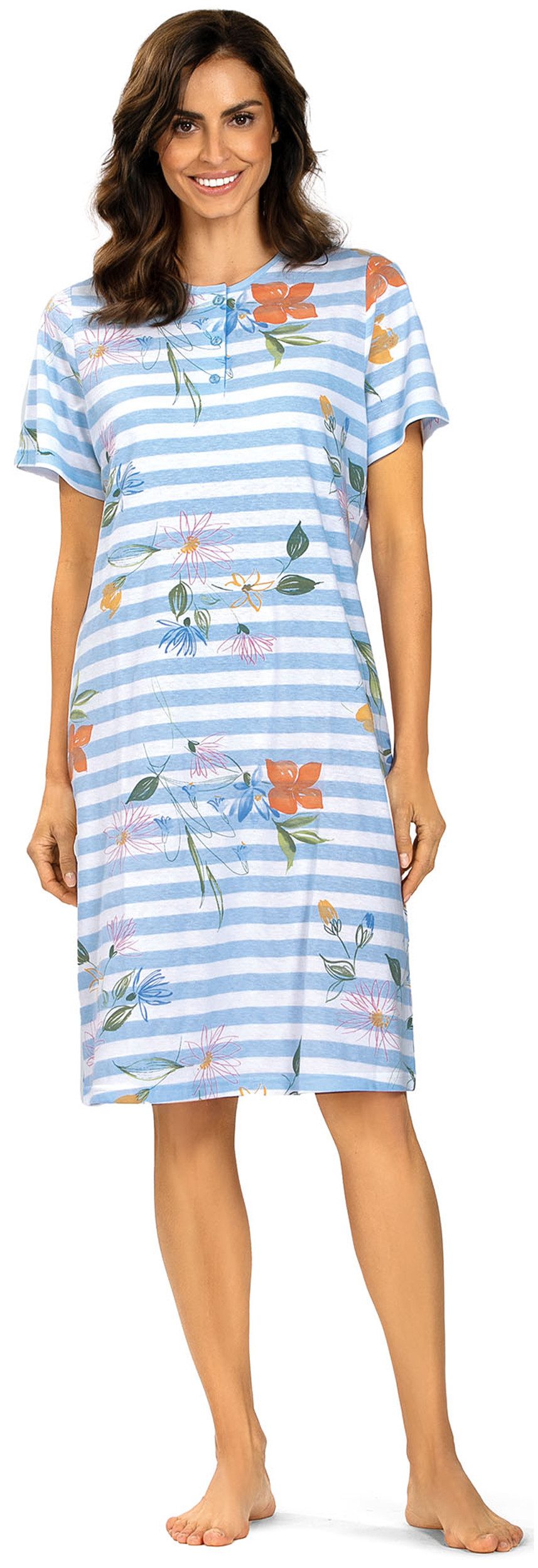 Ein besonderes Highlight ist der zarte Blumendruck, der dem Nachthemd einen femininen und romantischen Look verleiht. Die hellblauen Blockstreifen ergänzen das Blumenmuster perfekt und verleihen dem Nachthemd eine frische und moderne Note. Diese Kombination aus Blumen und Streifen sorgt für ein harmonisches und stilvolles Gesamtbild.