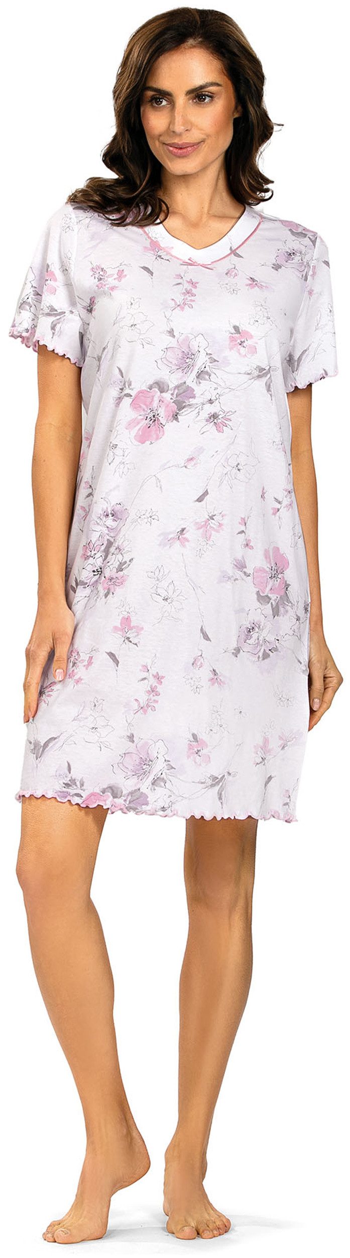 Ein besonderes Highlight ist der zarte Blumendruck, der dem Nachthemd einen femininen und romantischen Look verleiht. Die Ärmel und der Saum am Oberteil sind mit zarten Wellensäumen versehen, die das Design abrunden und für einen stilvollen Abschluss sorgen. Diese Details verleihen dem Nachthemd eine liebevolle und hochwertige Anmutung.