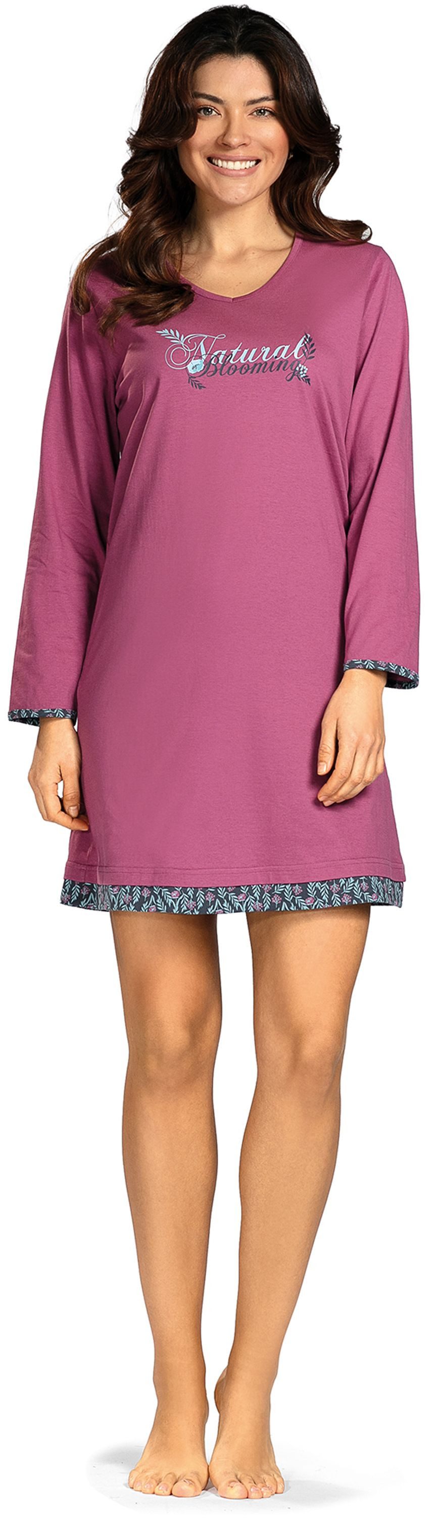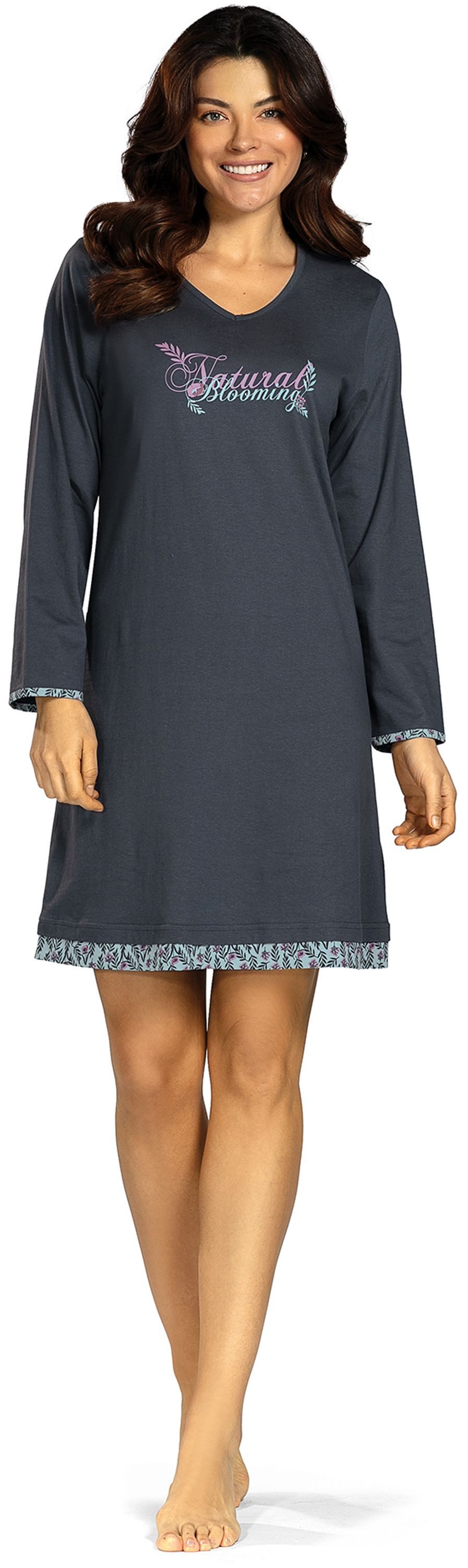Mit einer Длина von 95 Zentimetern präsentiert sich das Nachthemd in einer harmonischen Silhouette, die sowohl gemütlich als auch stilvoll wirkt. Der V-Ausschnitt verleiht dem Nachthemd eine moderne, feminine Note, während die langen Ärmel für behagliche Wärme sorgen. Ein besonderes Highlight ist der zarte Druck "Natural Blooming" auf der Brust, der dem Nachthemd eine frische, natürliche Ausstrahlung verleiht. Der feine Blumendruck, der sich als Abschluss an den Ärmeln, am Saum und im Nackenspiegel wiederfindet, rundet das Design harmonisch ab und verleiht dem Nachthemd eine romantische, blumige Note.