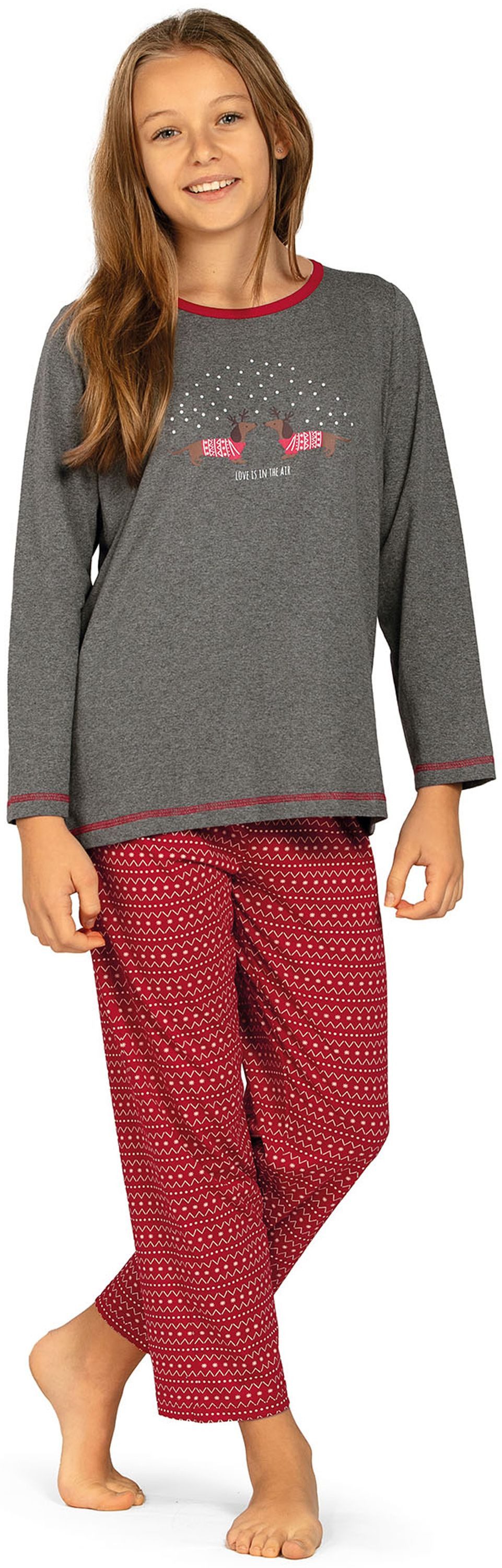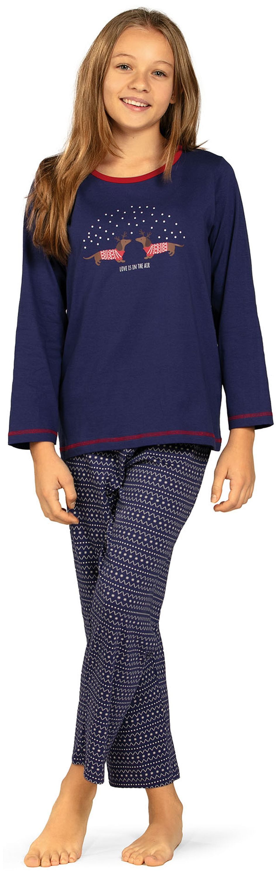 Dieser bezaubernde Mädchen-Schlafanzug aus weicher Baumwolle vereint kuscheligen Komfort mit einem festlichen, kindgerechten Design, das die Vorfreude auf die Weihnachtszeit weckt. Das langärmelige Oberteil besticht durch einen niedlichen Druck auf der Brust, der zwei fröhliche Dackel zeigt, die in einem winterlichen Szenario spielerisch in Szene gesetzt sind. Die Dackel-Motive, liebevoll und detailreich gestaltet, bringen ein Lächeln ins Gesicht und verbreiten eine warme, fröhliche Stimmung.