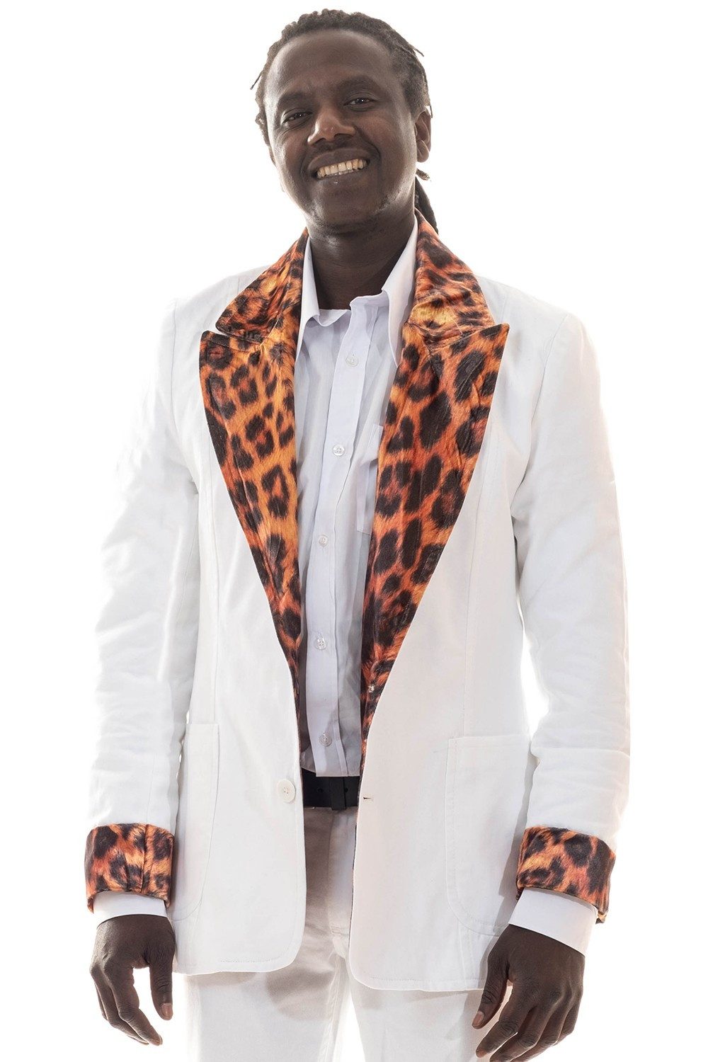 Beschreibung: Weißes Gabardine Sakko im 70er-Style mit einem Leopardenfell-Muster Besatz am Reverskragen und an den Manschetten! Wenn du nach einem ausgefallenen Outfit für die 70er-Motto-Party suchst, bist du hier genau richtig. Kombinieren kannst du das Sakko beispielsweise mit einer passenden Gabardine Schlaghose von Comycom in weiß oder schwarz. Das Sakko hat einen großen Reverskragen und zwei aufgesetzte Taschen. Der eher locker sitzenden Schnitt ermöglicht dir eine optimale Bewegungsfreiheit.