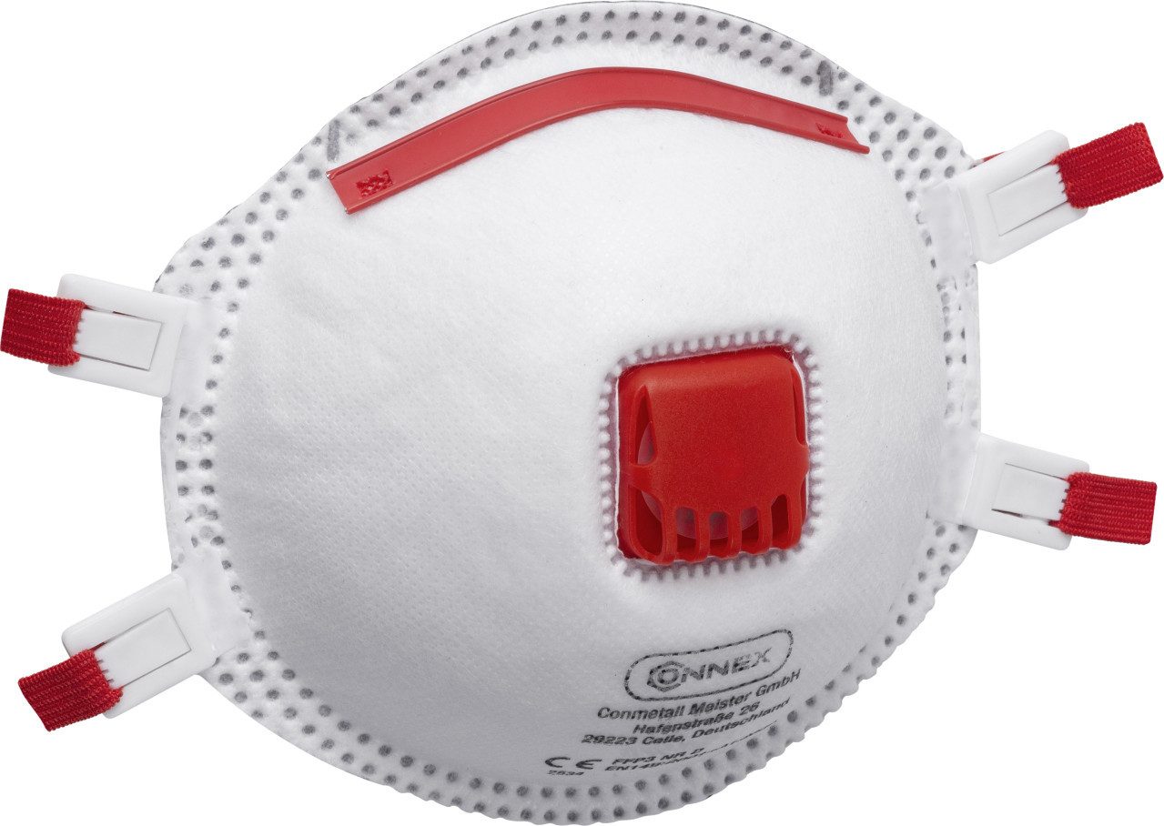 Produktdetails: Maße: 15 x 13 x 5 cm (B x H x T) | Material: Polypropylen (PP), Gummi, Polyurethan (PUR), Polyethylen (PE), Silikon | Farbe: weiß, rot | Norm: nach EN 149 | Ausstattung: Ventil, verstellbare Kopfbänder, verstellbarer Nasenbürgel, Dichtlippe | Inhalt: 5 Stück |