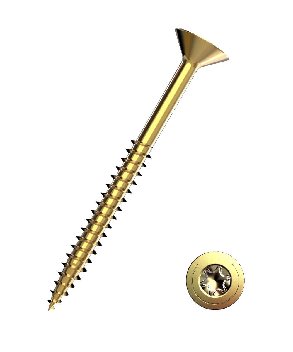 Maße: 5.0 x 35 mm | Antrieb: TX 25 | Inhalt: 250 Stück | Kopfart: Senkkopf | Gewinde: Teilgewinde | Material: Stahl galvanisiert, gelb verzinkt |