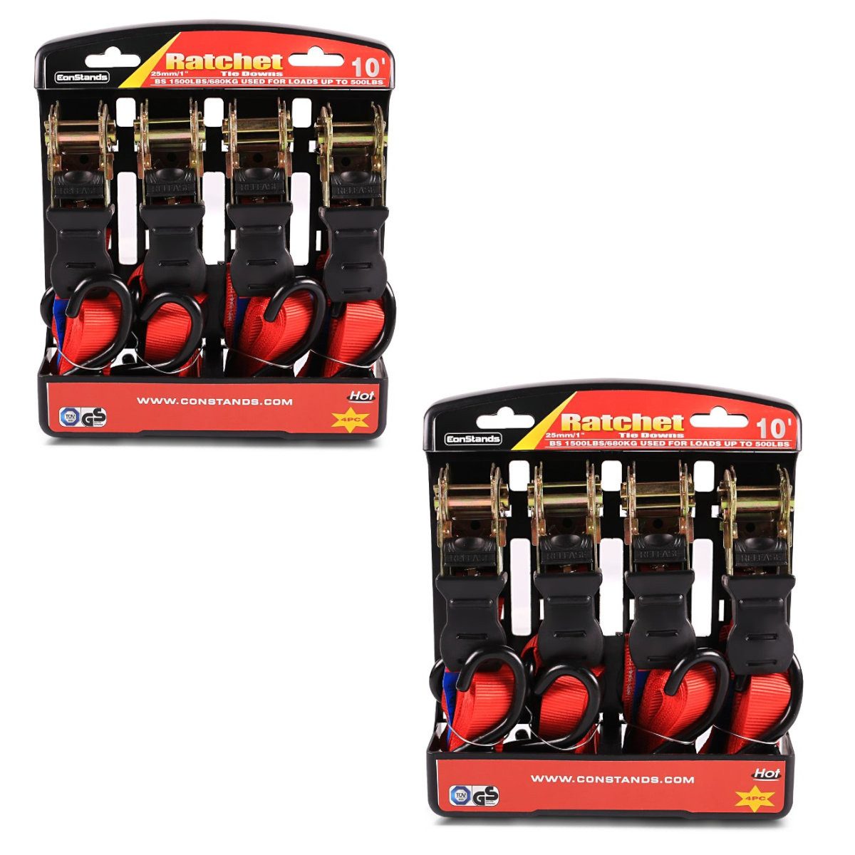 Lieferumfang: (2x Artikel 982853) 2x Spanngurt Set ConStands mit Ratsche und Haken inkl 4x Zurrschlaufe in rot