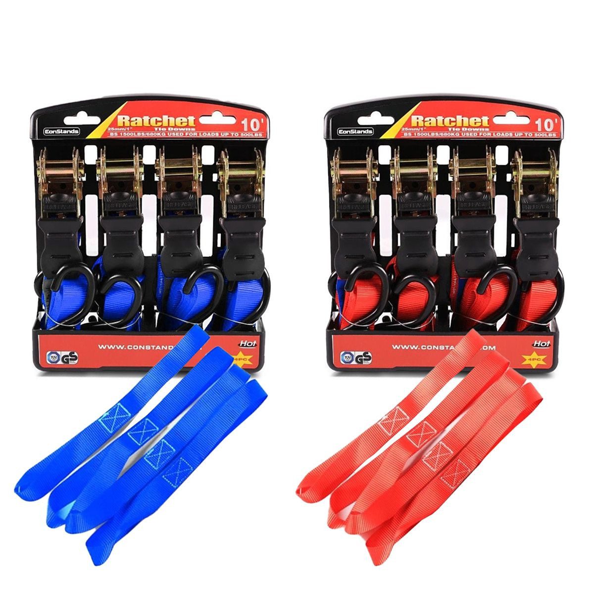 • Set besteht aus zwei mal 4x Spanngurte mit Ratsche und Zurrschlaufen in rot und blau