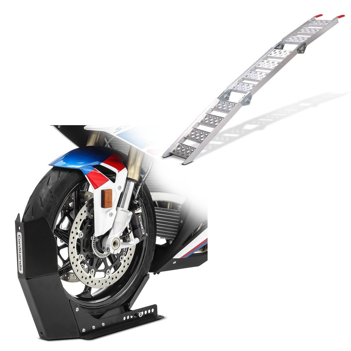 Lieferumfang: Auffahrrampe bis 270 kg Alu-III dreifach klappbar + Transportständer Easy-Fix Wippe bis 21 Zoll schwarz-matt