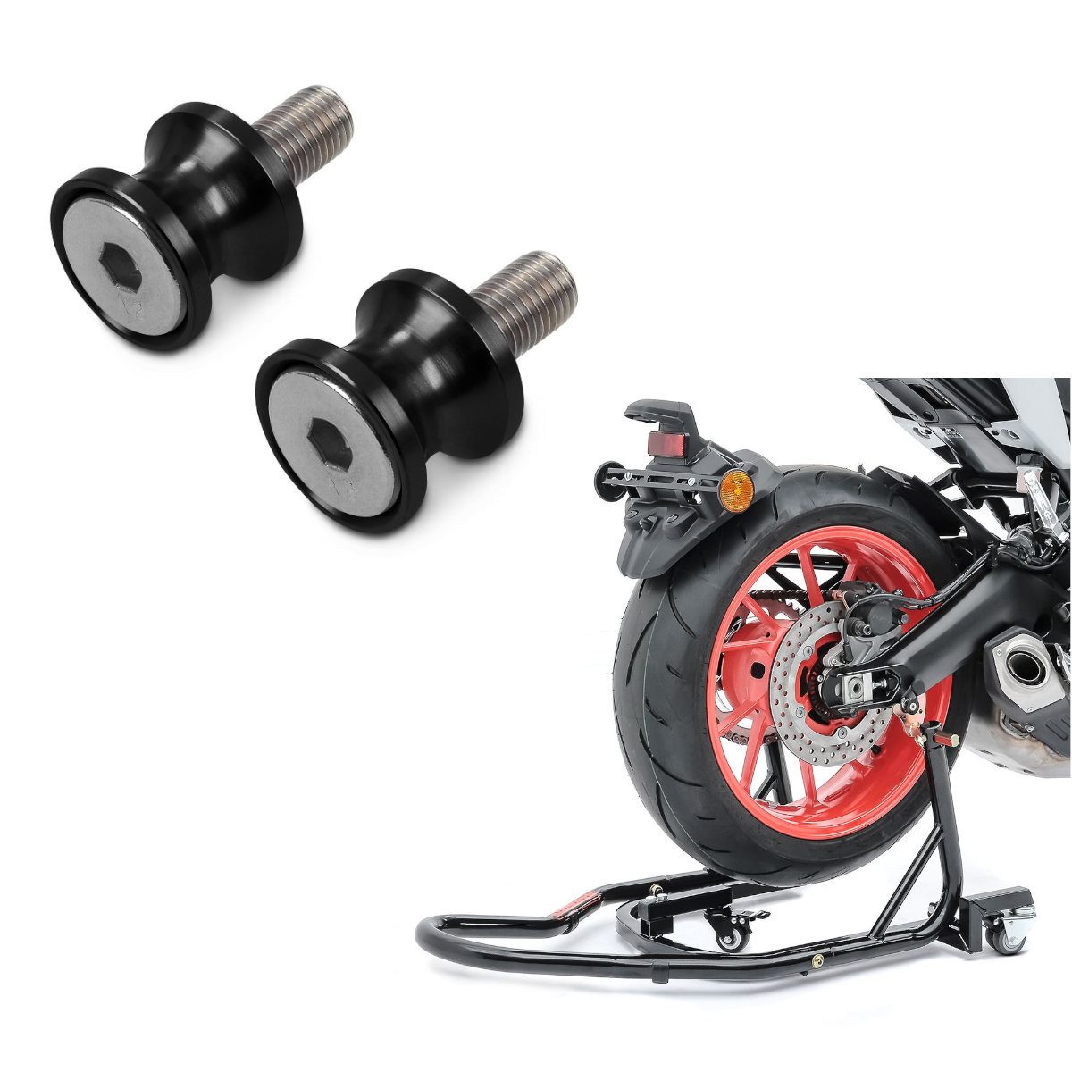 Lieferumfang: Rangierhilfe Montageständer Hinterrad Mover 2 Racing schwarz matt + Prismabuchsen-Racingadapter Motea Jerez M8 schwarz