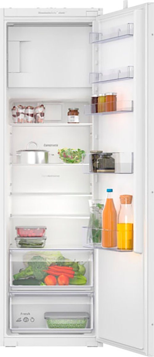 Der Einbaukühlschrank »CK282NSE0« ist von der Marke Constructa und integrierbar. Das Modell bietet ausreichend Platz für deinen Einkauf durch seine Maße von 54,1 x 177,2 x 54,8 cm (B/H/T) und das Gefriervolumen von 34 l und Kühlvolumen von 246 l. Das Betriebsgeräusch des Modells liegt bei 35 dB. Zwei Gemüseschubladen und ein Gefrierfach mit Klappe stehen zur Verfügung, um den Einkauf zu verstauen. Auf fünf Ablageflächen aus Sicherheitsglas, davon vier höhenverstellbar, ist im Einbaukühlschrank genug Raum für Lebensmittel. Die fünf Türablagen ermöglichen eine übersichtliche Aufbewahrung. Durch die Supergefrier-Funktion lassen sich Lebensmittel besonders schnell kühlen und einfrieren. Bei offen stehender Tür meldet dies der Einbaukühlschrank mit einem optischen und akustischen Warnsignal. Всеs im Blick hat man außerdem dank der LED-Innenbeleuchtung. Der »CK282NSE0« von Constructa ist ein Einbaukühlschrank, der mit seinen Features überzeugt und genug Platz für Nahrungsmittel aller Art bietet.