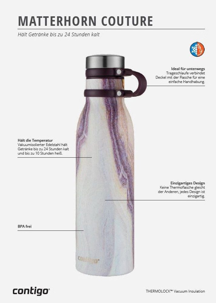 Die Matterhorn aus der Couture Kollektion von Contigo hat ein einzigartiges Äußeres, jede Flasche ist ein Einzelstück, keine ist identisch zu den anderen. Aber sie sieht nicht nur gut aus und man freut sich jeden Tag wieder sie aus der Tasche zu fischen, durch die TERMALOCK&tm; Vakuumisolierung hält diese Flasche Getränke bis zu 24 Stunden kalt oder 10 Stunden warm. Um die Flasche besser Reinigen zu können, kann man das Mundstück aus der Öffnung entfernen (dadurch kann man auch ganz einfach Eiswürfel in die Flasche füllen). Damit du den Deckel nicht verlieren kannst, ist dieser mit einem flexiblen Band direkt an der Flasche befestigt. Все Teile der Flasche sind selbstverständlich BPA frei. Du kannst die Flasche ganz einfach per Hand reinigen.