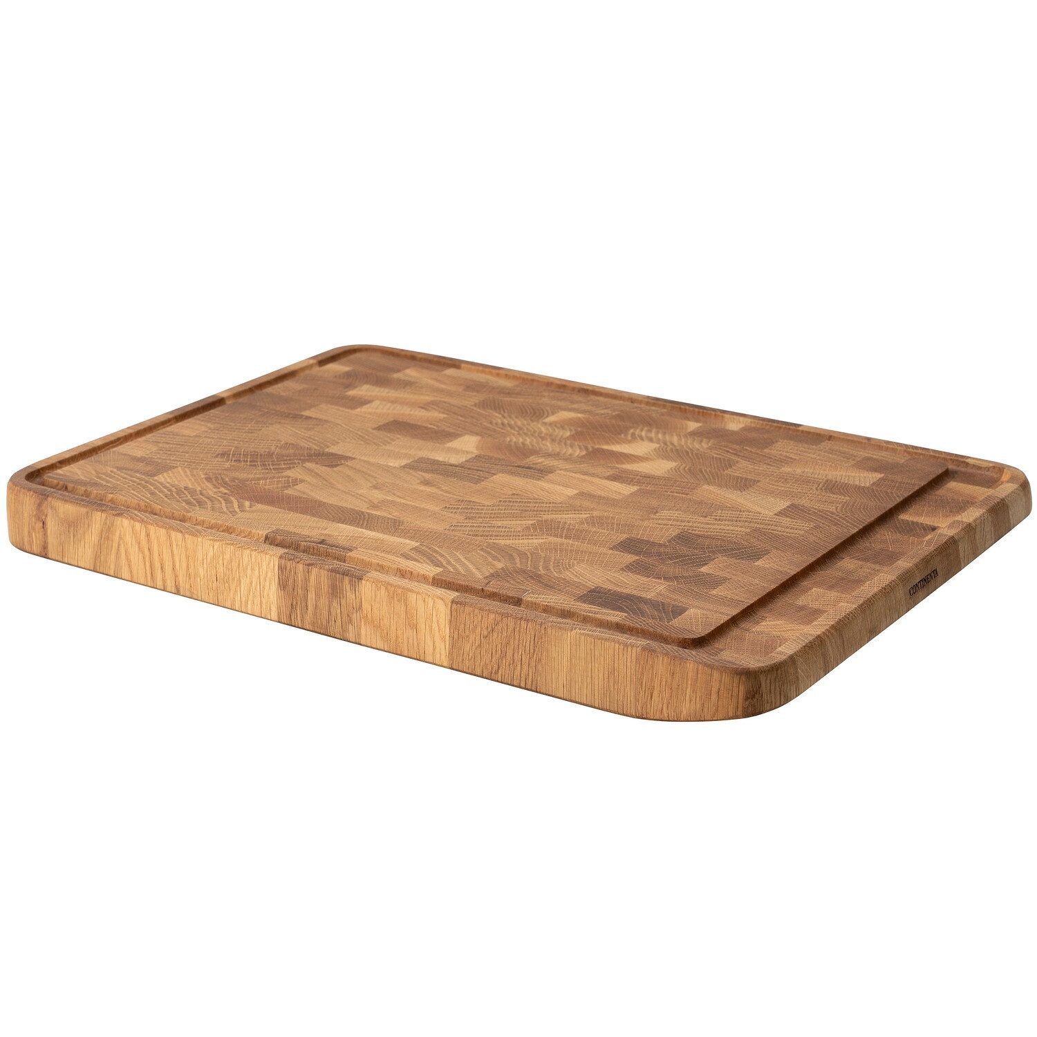 Exzellente Profiqualität für präzise Schneidearbeiten mit dem CONTINENTA Tranchierbrett aus Stirnholz Eiche Die Suche nach dem idealen Schneidebrett für die anspruchsvolle Küche endet hier. Das CONTINENTA Tranchierbrett Stirnholz Eiche vereint Profiqualität mit außergewöhnlichen Schneideeigenschaften, was jeden Küchenalltag bereichert. Gefertigt aus sorgfältig ausgewähltem Eichen-Stirnholz und mit lebensmittelechtem Öl veredelt, bietet dieses Schneidebrett nicht nur eine robuste und langlebige Oberfläche, sondern begeistert auch durch seine natürliche und ansprechende Optik. Die breite Saftrille fängt beim Schneiden von Fleisch, Gemüse oder Obst sämtliche Säfte auf, was die Küchenarbeit deutlich sauberer und effizienter macht. Gleichzeitig sorgt die massive Verarbeitung mit hoher Materialstärke für eine zuverlässige Basis, die bei keiner Zubereitung wackelt oder nachgibt, und somit für zusätzliche Sicherheit in der Küche. Einzigartige Optik trifft ultimative Funktionalität Neben seiner beeindruckenden Funktionalität besticht das CONTINENTA Tranchierbrett auch durch sein einzigartiges Design. Jedes Schneidebrett ist aus einzeln Holzwürfeln zusammengesetzt, die gemeinsam ein reizvolles Mosaik ergeben. Dieses Design macht das Tranchierbrett nicht nur zu einem praktischen Küchenhelfer, sondern auch zu einem stilvollen Accessoire auf jeder Arbeitsfläche. Die praktische Kante am Rand des Brettes erleichtert das Greifen und Heben, was den Umgang mit und die Pflege des Schneidebretts praktikabel gestaltet. Man wird schnell bemerken, wie sehr diese durchdachten Details den Unterschied in der täglichen Handhabung machen. Hochwertige Materialien für ein langlebiges Küchenerlebnis Die Auswahl hochwertiger Materialien und eine sorgfältige Verarbeitung garantieren die Langlebigkeit und Beständigkeit des CONTINENTA Tranchierbretts. Das mit lebensmittelechtem Öl veredelte Eichen-Stirnholz bewahrt nicht nur seine schöne Optik, sondern sorgt auch dafür, dass das Brett mit der Zeit eine ansprechende Patina entwickelt. Die massive Materialstärke und die professionellen Schneideeigenschaften gewährleisten, dass man lange Freude an diesem Küchenhelfer haben wird. Ob Profi oder Hobbykoch, mit diesem Schneidebrett bringt man Profiqualität in jede Küche. Pflegehinweis Holz ist ein reines Naturprodukt. Nur feucht abwischen und stehend trocknen. Zu intensive Feuchtigkeit bzw. Temperaturunterschiede können zu Verformungen, Rissen und Verfärbungen führen. Dies ist kein Reklamationsgrund. Die Pflege der geölten Oberflächen mit einem Holz-Balsam (z. B. von CONTINENTA) verlängert die Schönheit und Lebensdauer der Produkte. Dieser Artikel enthält nichttextile Teile tierischen Ursprungs.