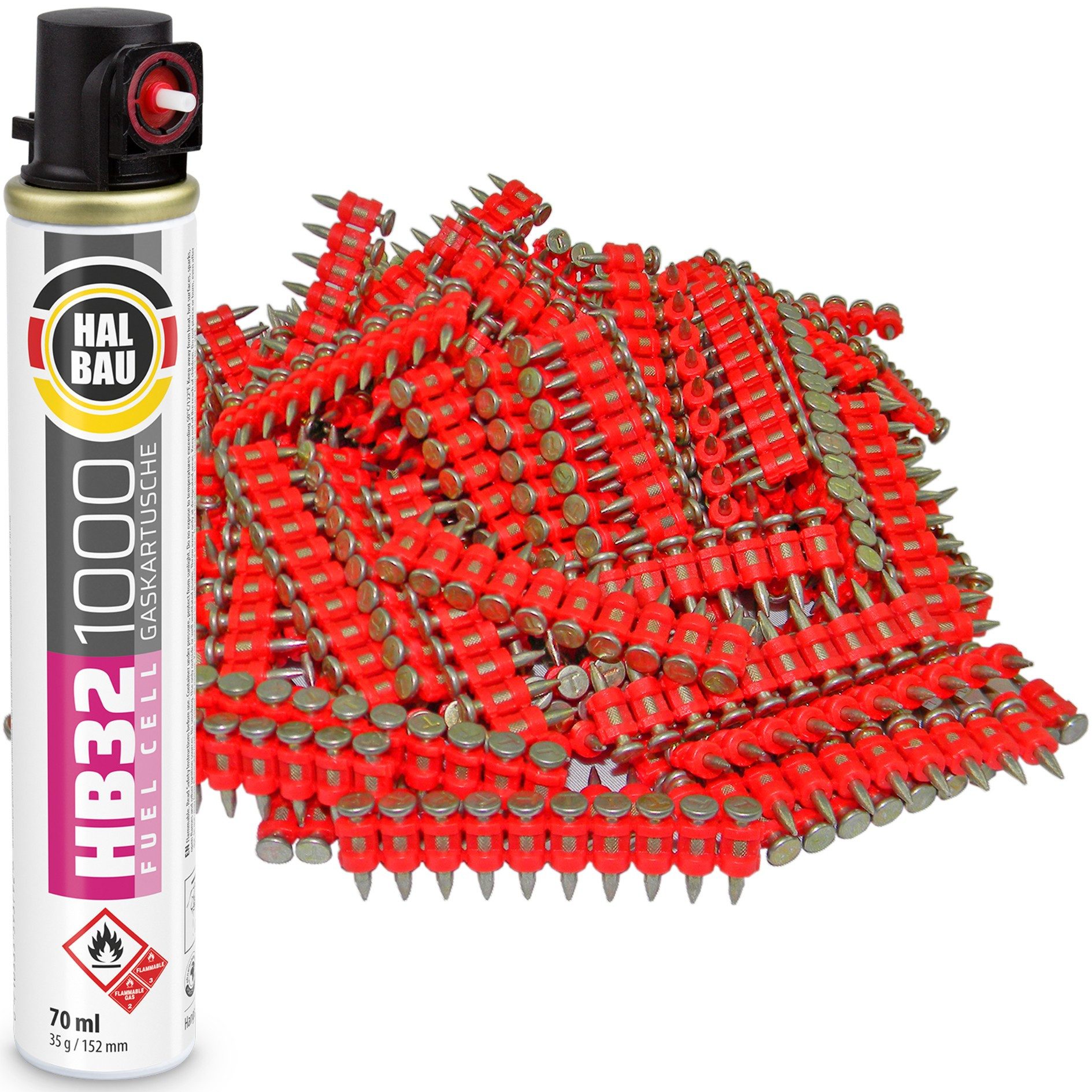 Gaskartusche mit Eckventil für gasbetriebene Setzgeräte für Stahl und Beton. Es ist ein effizientes mit 100% synthetischem Öl geschmiertes Gas, das ein reibungsloses Betreiben von Geräten gewährleistet. Das hochreine Gas sorgt dafür, dass es im Magazin zu keinen Ablagerungen kommt. Die hohen Leistungsparameter machen den Setzvorgang effizienter. Keine Ausfallzeiten durch Aufladen. Die mit Gas versorgten Hochdruckgeräte sind zum Versetzen von gehärteten, mittels Plastik magazinierten Nägeln vorgesehen, die im Lieferumfang bestückt je 10 Stück auf Band verpackt werden.