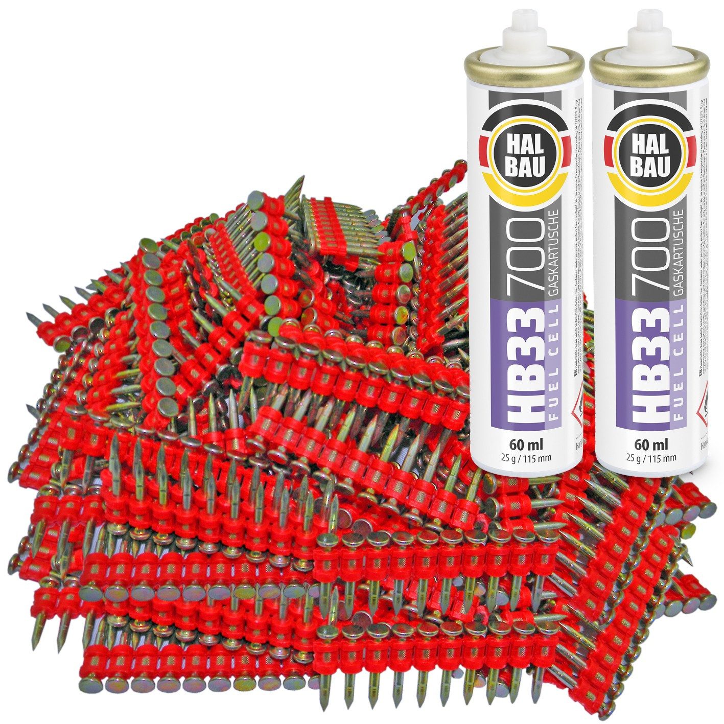 Gaskartusche mit Eckventil für gasbetriebene Setzgeräte für Stahl und Beton. Es ist ein effizientes mit 100% synthetischem Öl geschmiertes Gas, das ein reibungsloses Betreiben von Geräten gewährleistet. Das hochreine Gas sorgt dafür, dass es im Magazin zu keinen Ablagerungen kommt. Die hohen Leistungsparameter machen den Setzvorgang effizienter. Keine Ausfallzeiten durch Aufladen. Die mit Gas versorgten Hochdruckgeräte sind zum Versetzen von gehärteten, mittels Plastik magazinierten Nägeln vorgesehen, die im Lieferumfang bestückt je 10 Stück auf Band verpackt werden.