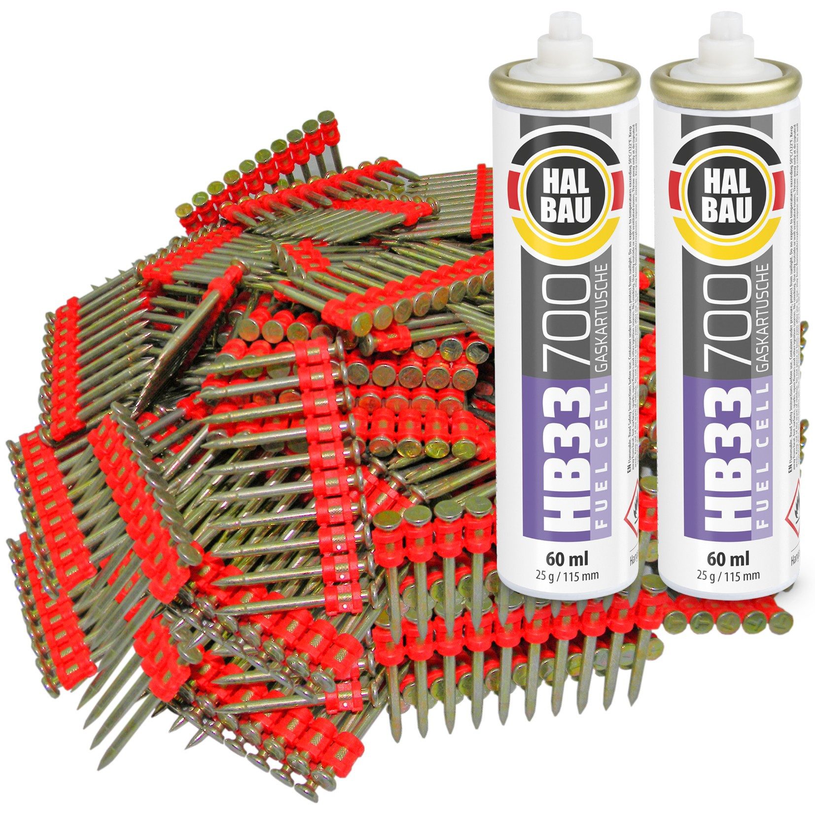 Gaskartusche mit Eckventil für gasbetriebene Setzgeräte für Stahl und Beton. Es ist ein effizientes mit 100% synthetischem Öl geschmiertes Gas, das ein reibungsloses Betreiben von Geräten gewährleistet. Das hochreine Gas sorgt dafür, dass es im Magazin zu keinen Ablagerungen kommt. Die hohen Leistungsparameter machen den Setzvorgang effizienter. Keine Ausfallzeiten durch Aufladen. Die mit Gas versorgten Hochdruckgeräte sind zum Versetzen von gehärteten, mittels Plastik magazinierten Nägeln vorgesehen, die im Lieferumfang bestückt je 10 Stück auf Band verpackt werden.