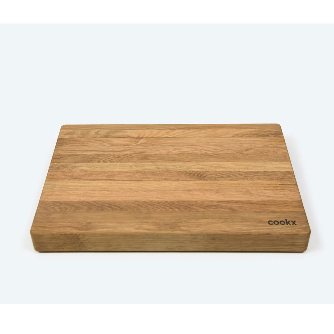 Mit einer Размер von ca. 30 x 40 x 4 cm bietet das Hackbrett genug Platz für kraftvolle Schnitte, ohne auf Flexibilität zu verzichten. Die stabile Eichenoberfläche schützt Ihre Messer und verhindert ein Durchschneiden zur Arbeitsplatte. Das dezent eingravierte COOKX-Logo in der unteren Ecke steht für echte Handwerkskunst und langlebige Qualität.