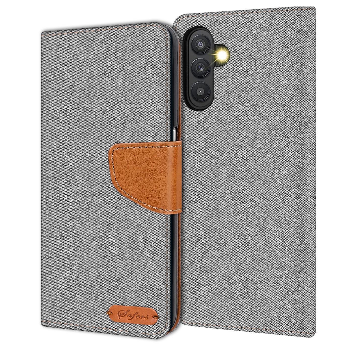 Keine Lust mehr auf Kunstleder oder Plastik? Du möchtest lieber mal was neues ausprobieren? Das Bookcase im trendigen Jeans Design ist ein kompletter Gegensatz zu vielen auf dem Markt erhältlichen Handytaschen. Der Polsterstoff der Außenhülle sorgt für eine angenehme Haptik und verleiht deinem Samsung Galaxy A13 5G ein geschmackvolles Aussehen. Die zarten Akzente im cognac-farbenen Kunstleder unterstützen das schicke Design und setzen dein Handy gekonnt in Szene. Die Halteschale aus flexiblem Silikon hält das Gerät fest umschlossen und ermöglicht dennoch die Nutzung aller Anschlüsse und Ports. Das robuste Case sorgt für einen Rundumschutz und sichert neben allen Kanten und Ecken auch das empfindliche Display. Das Material wirkt stoßabweisend und sichert dein Smartphone erfolgreich vor wertmindernden Schäden. Auf der Innenseite bietet das Cover Platz für Kreditkarten und Co, sie fungiert somit als idealer Geldbeutel-Ersatz. Ein weiterer Vorteil dieser stilvollen Handyhülle ist die integrierte Aufstellfunktion.