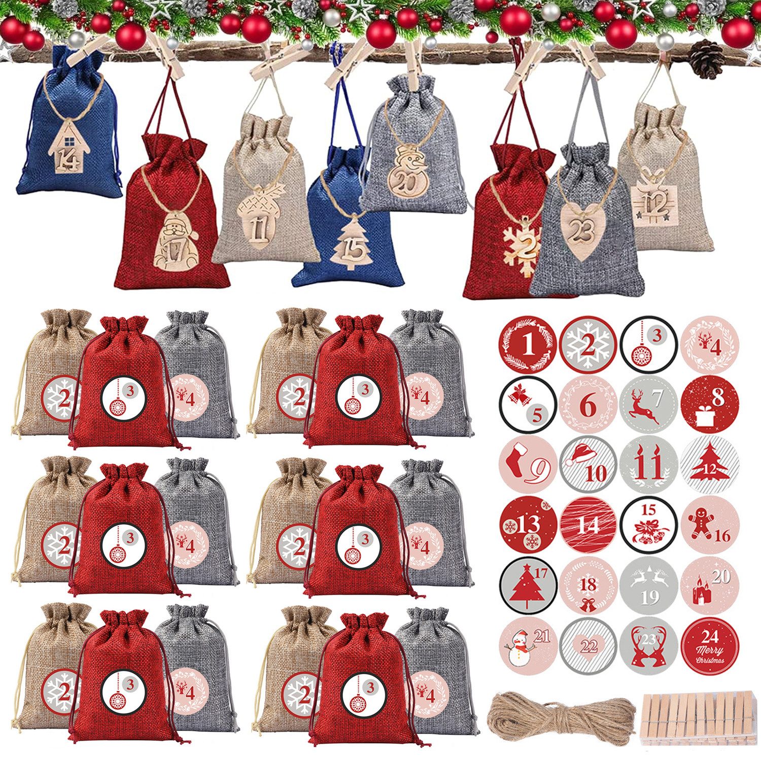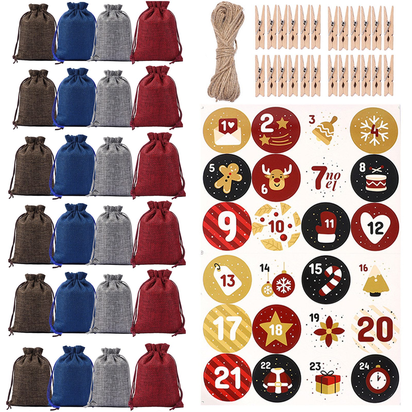 Dieses Adventskalender-Set enthält 24 Jutesäckchen (10*14 cm), 24 kleine Holzklammern, 100 cm Jutegarn (Kunstgarn) und nummerierte Aufkleber. Sie können Ihrer Kreativität freien Lauf lassen und ganz einfach Ihren eigenen Adventskalender gestalten. Es ist perfekt für Kinder und Erwachsene, um gemeinsam die Weihnachtsfreude zu genießen.
