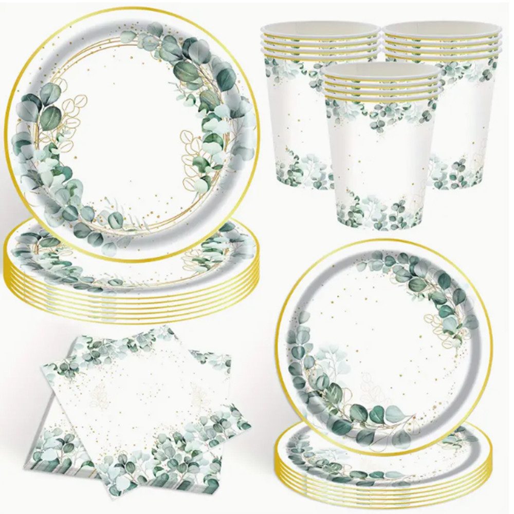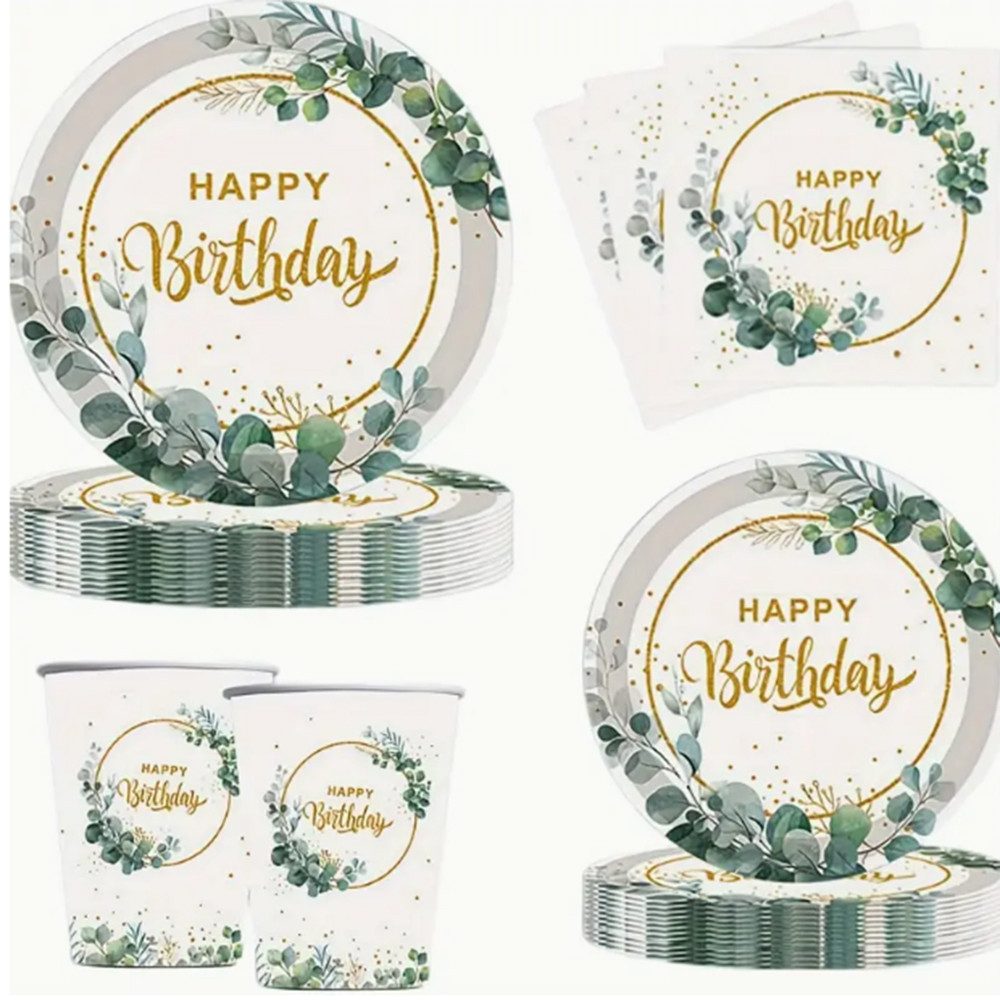 Dieses Geburtstagsgeschirr enthält alles, was Sie für 20 Gäste brauchen: 20 9-Zoll-Essteller, 20 7-Zoll-Dessertteller, 20 Becher, 20 Servietten.