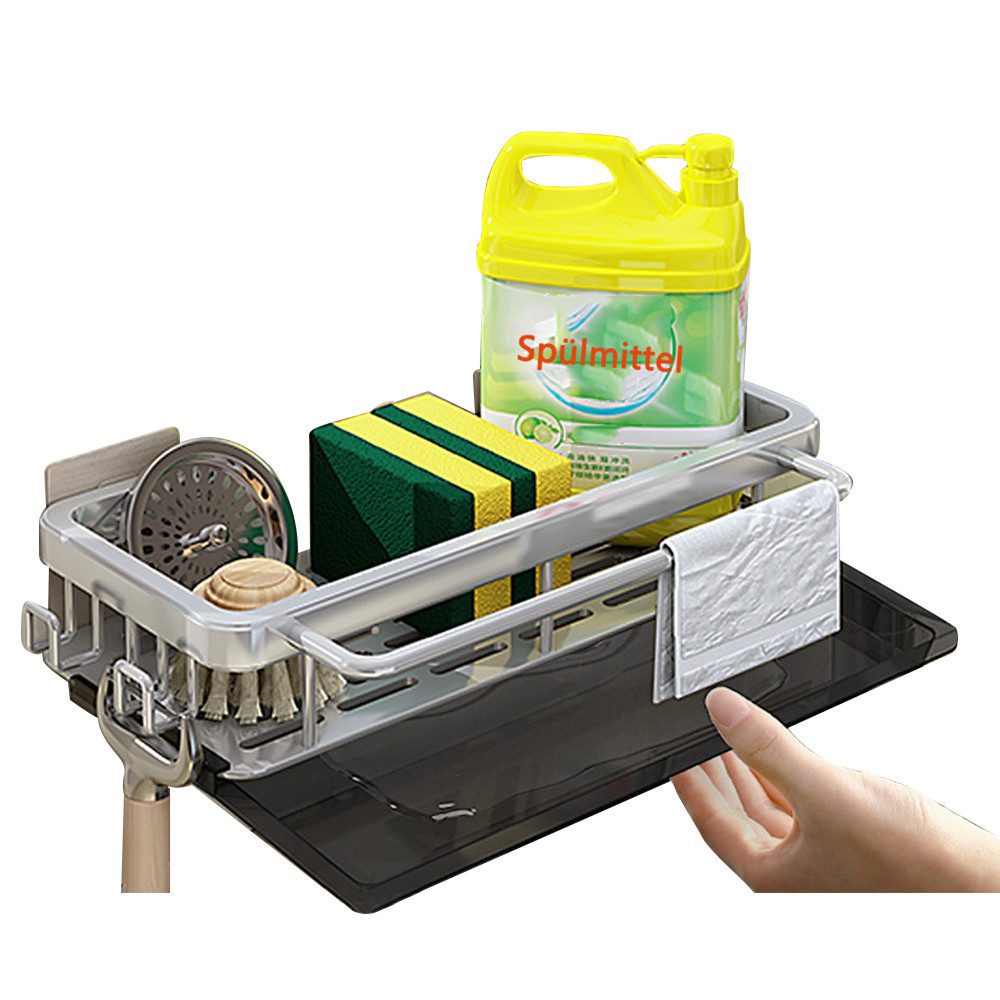 Smart Design Einfacher zu verwenden: Die vordere Aufhängungsstange bietet Platz zum Aufhängen und Trocknen von Geschirrtüchern. An der Seite des spüle organizer befinden sich zwei feste Haken, an denen Messer oder Geschirrbürsten aufgehängt werden können. Die leicht abnehmbare Tropfschale unten verhindert Wassertropfen und erleichtert die Reinigung