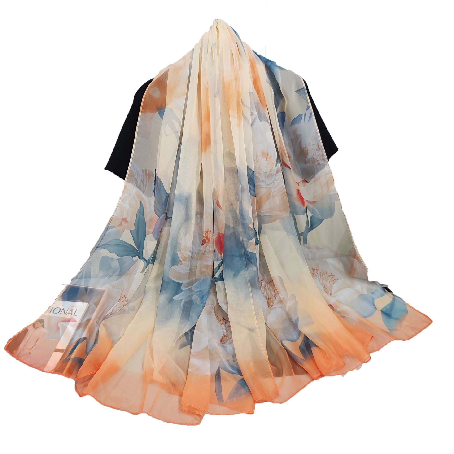 TOUCH & FEEL - Floral Print Chiffon Schals sind leicht und zart fhlen, atmungsaktiv und komfortabel, Bild, dass Sie auf der Stra e mit flie enden Chiffon Schal gehen.