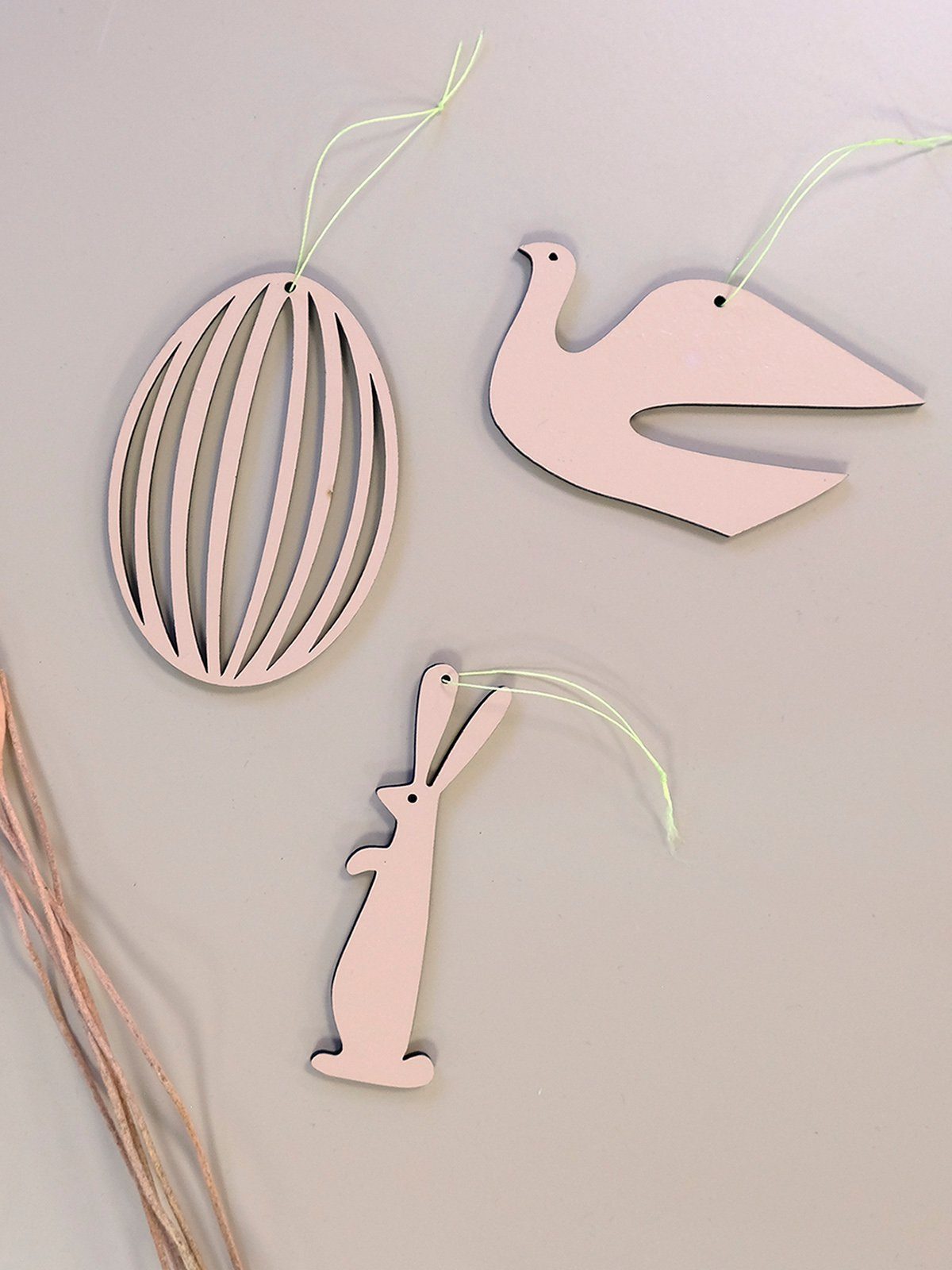 Der Hase, die Taube und das grafische Ei sind ein tolles Trio für den Zweig zu Ostern. Gepaart mit dem neonfarbigen Band wird es frisch und sehr stylisch.